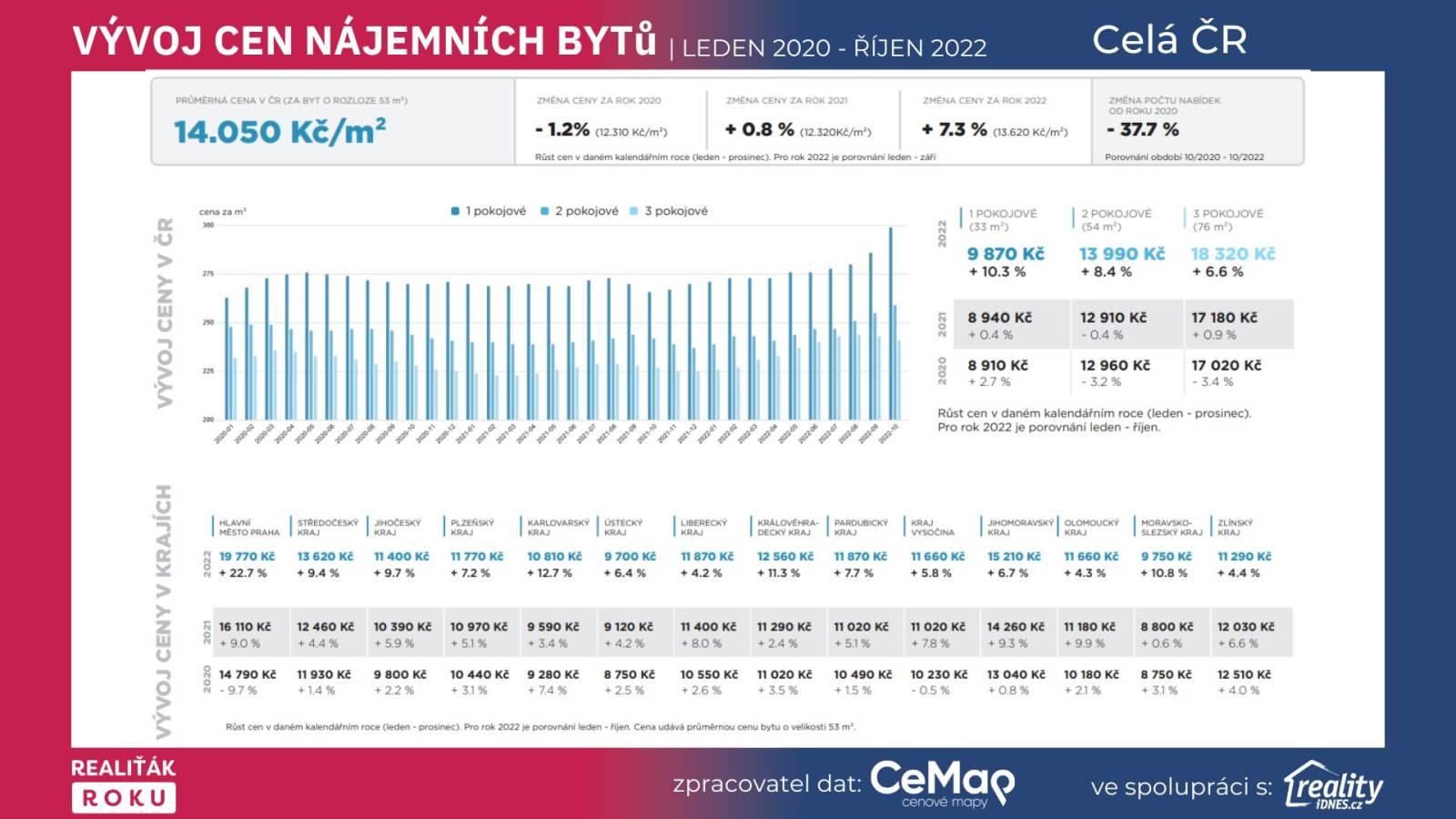 Graf č.1: Vývoj cen nájemných bytů leden 2020 - říjen 2022 (ověřená exluzivní data projektu Realiťák roku ve spolupráci s CEMAP - cenové mapy a portálu Reality.iDNES.cz)