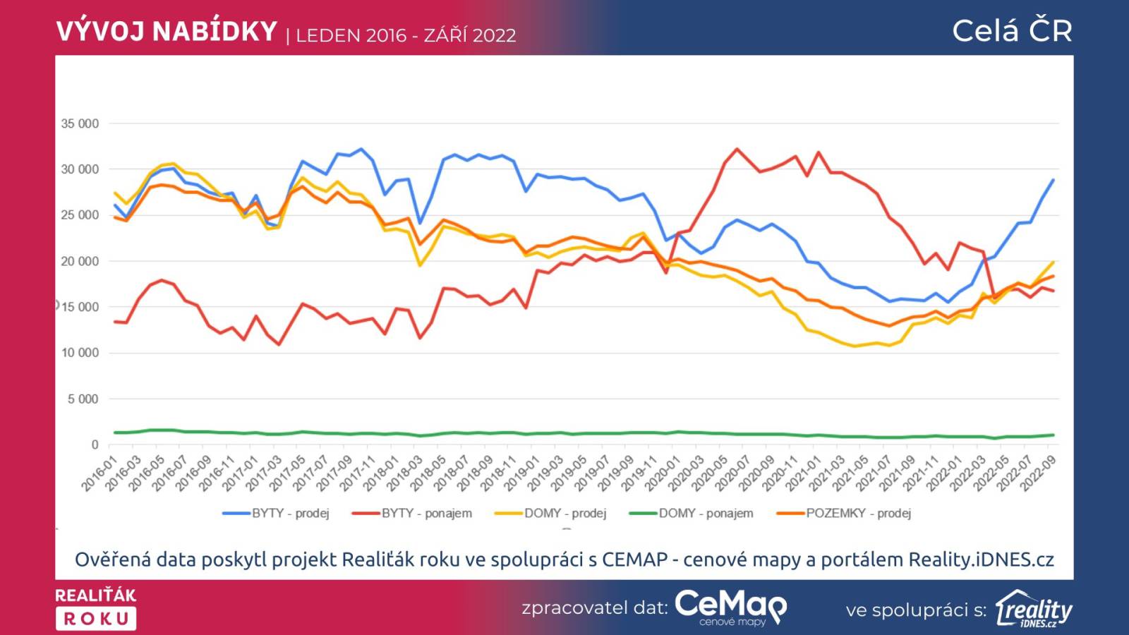 Graf č.6: vývoj nabídky - leden 2016 - září 2022 (ověřená exluzivní data projektu Realiťák roku ve spolupráci s CEMAP - cenové mapy a portálu Reality.iDNES.cz)