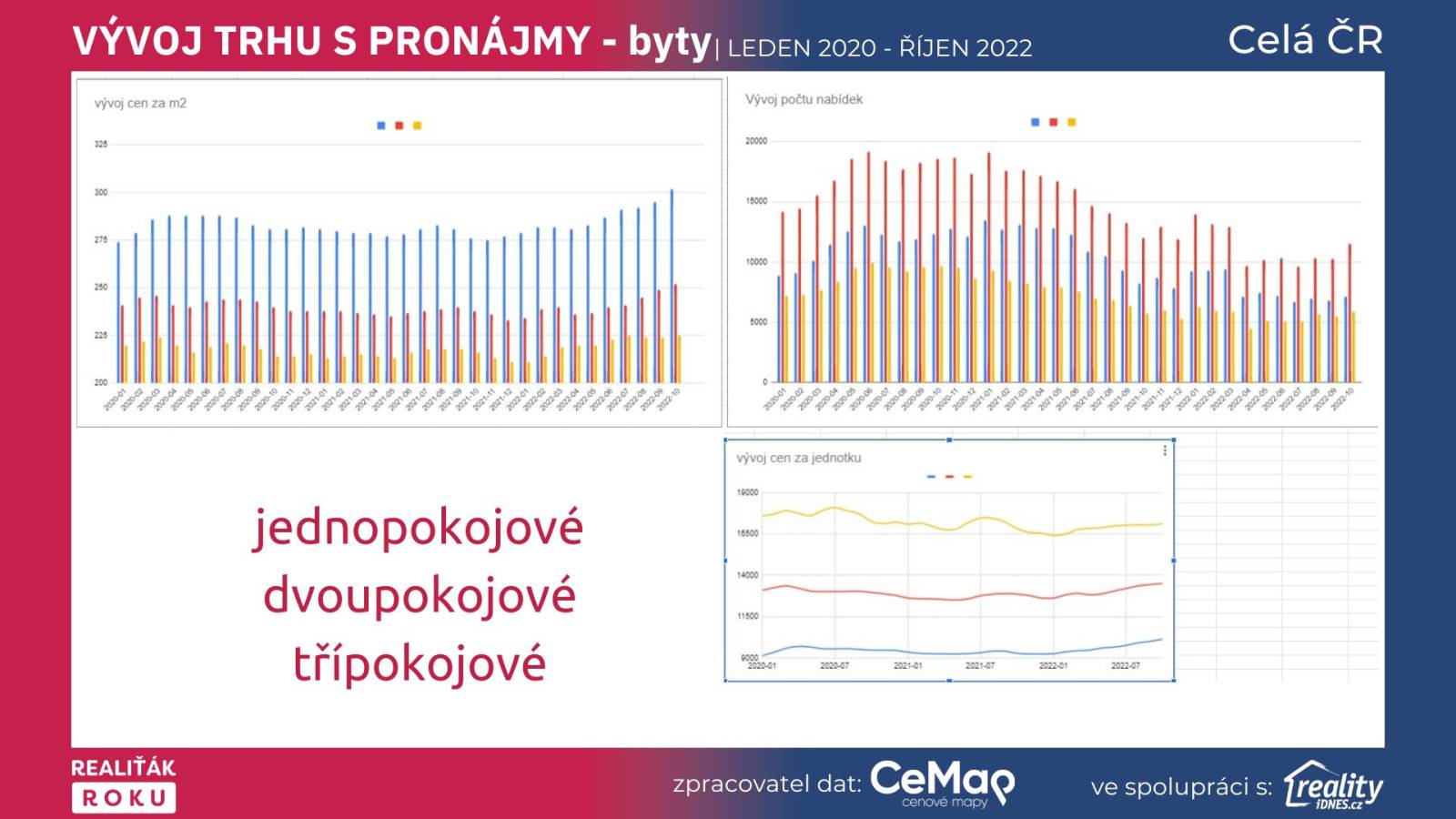A když se zase podíváme na nějaký čísla zase ohledně toho, jak se vyvíjely ceny za jednotku. Teď nebudeme říkat za metr čtvereční. Protože u těch pronájmů to jako úplně není to ten správnej indikátor. Tak vlastně tam to stoupá o koruny v rámci těchto období jo. Což je vlastně nic. Jo člověk vidí v novinách titulky prostě raketově rosteme, obrovskej, obrovský zájem nejsou. Aby to potom člověk podívá vlastně fakt na ty čísla, tak to vypadá úplně jinak. Tomáši.