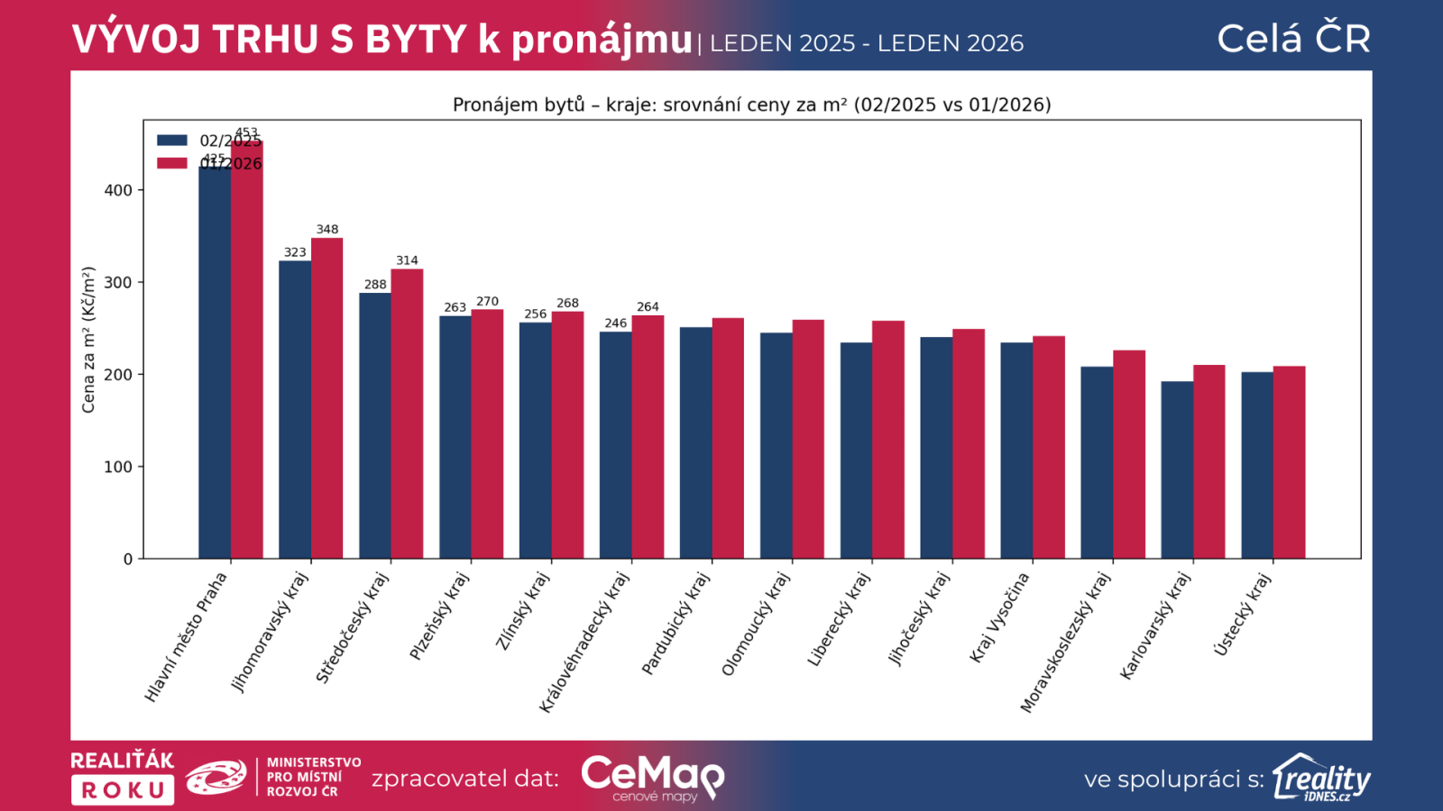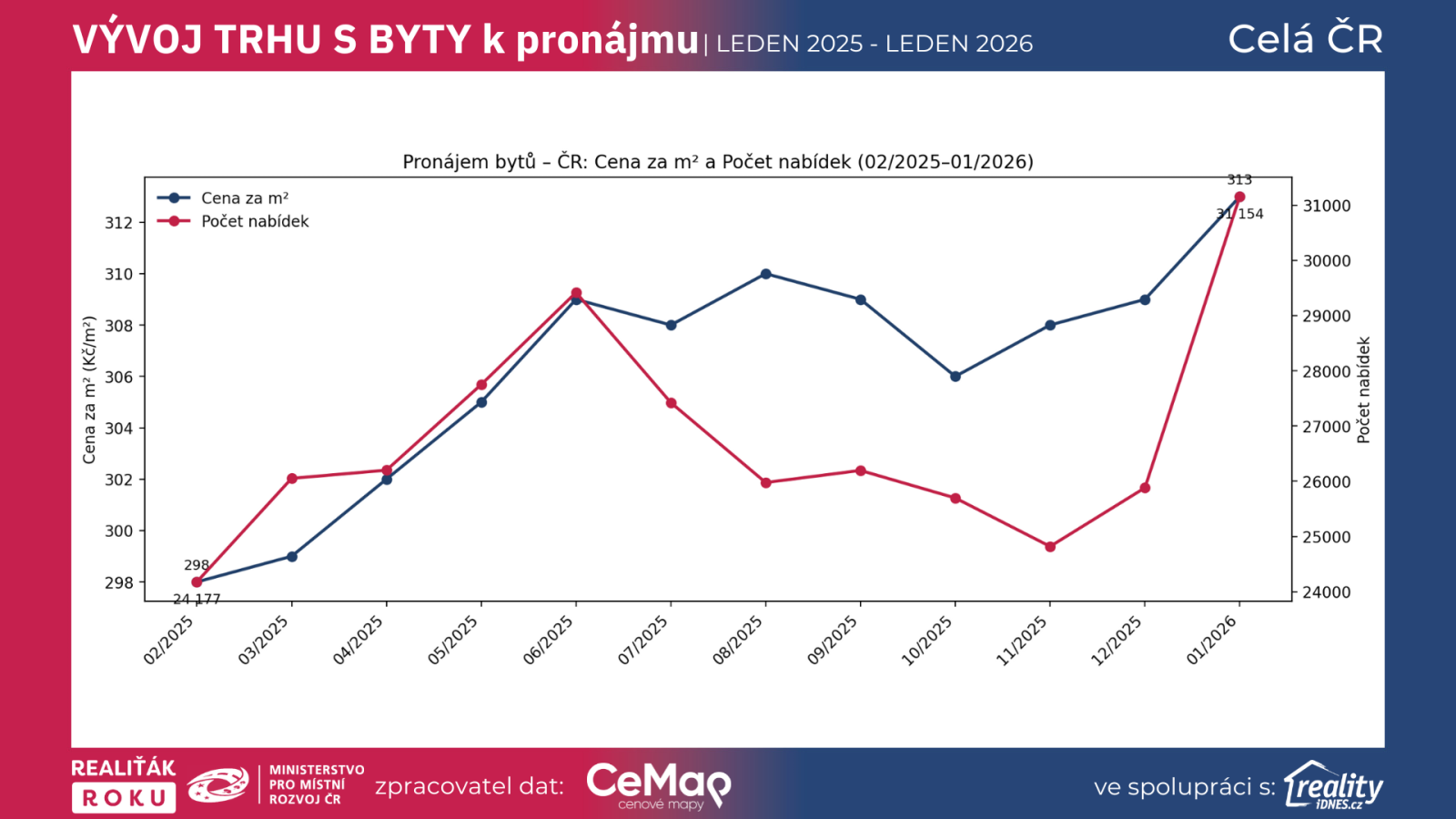 Cena za m²: 296 (01/2025) → 313 Kč/m² (01/2026) = +5,74 %