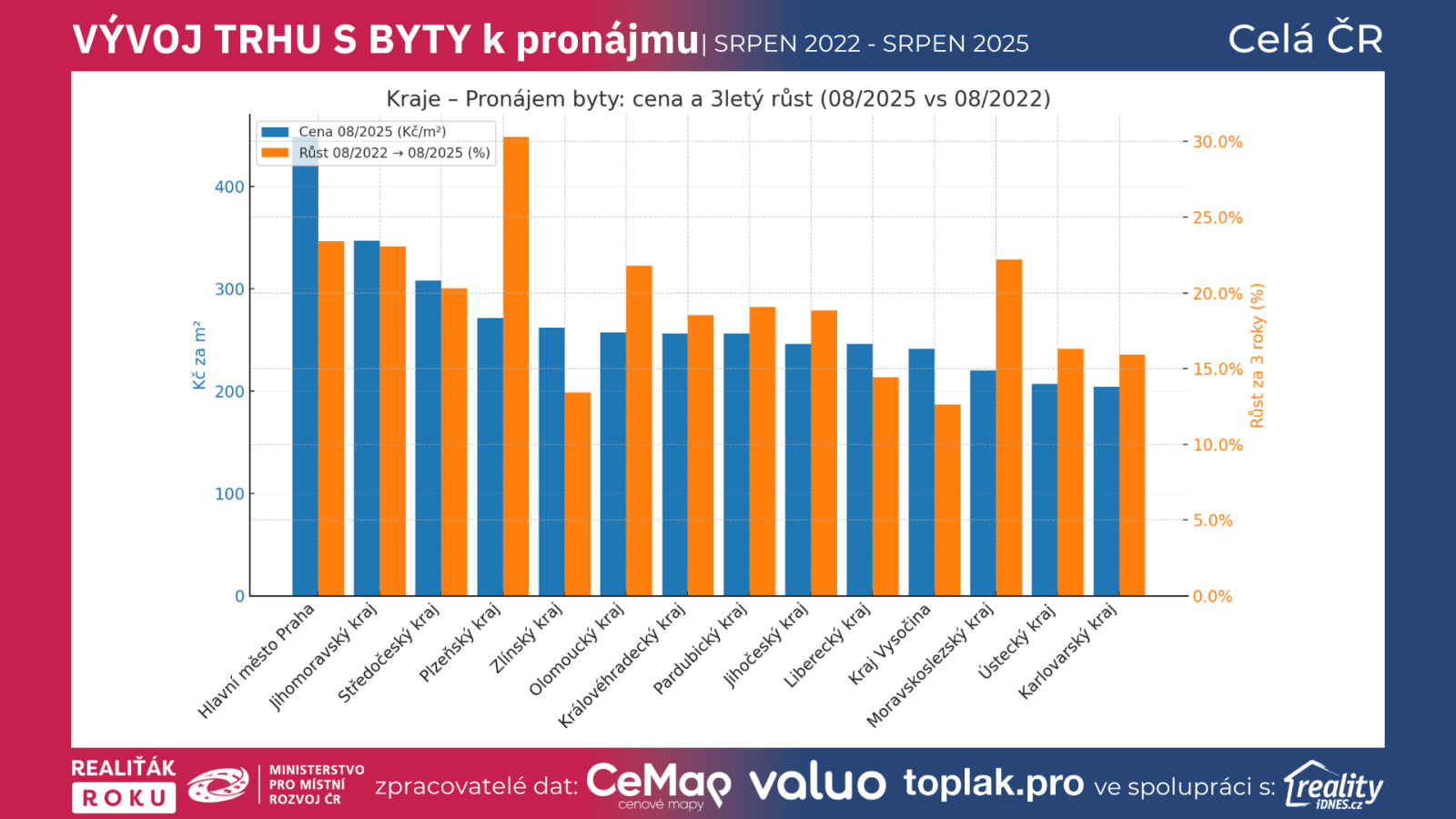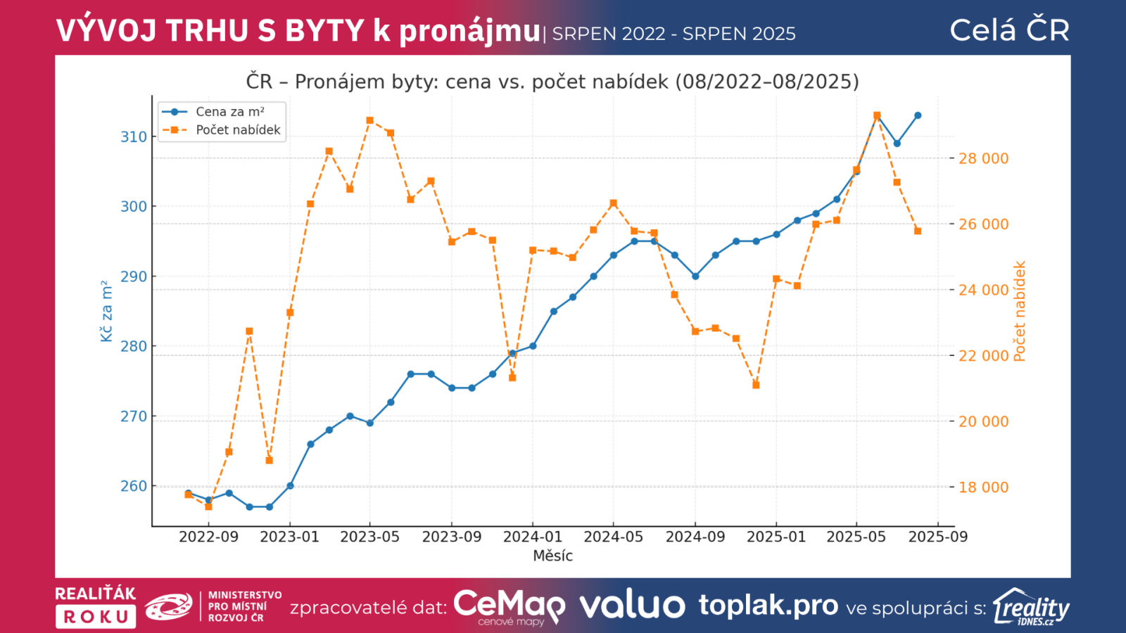 ČR – Pronájem byty: 313 Kč/m² (08/2025) vs. 259 Kč/m² (08/2022) → +20,8 %; 25 777 nabídek; 25 dní inzerce.