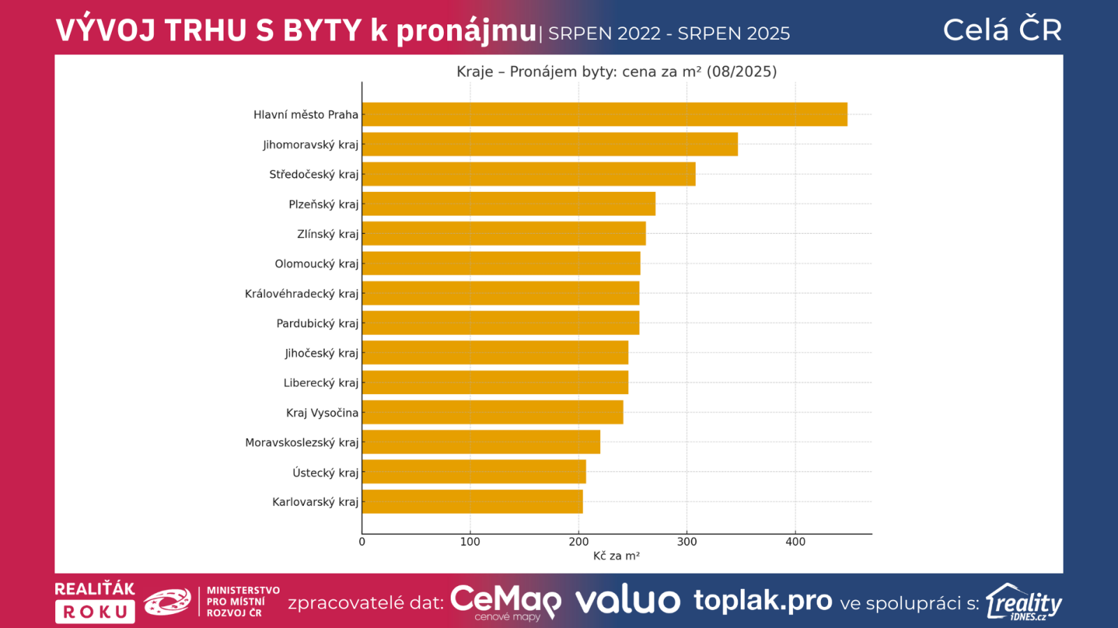 Nejdražší kraje 08/2025: Praha 448, Jihomoravský 347, Středočeský 308 (Kč/m²).