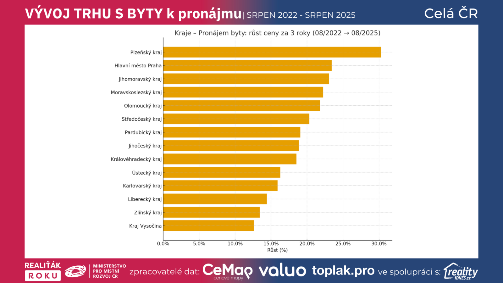Interpretace pro čtenáře: nájemní trh se „rozlévá“ po celé republice. Tahouny jsou logicky Pražsko a Brněnsko, ale rychlý růst teď vidíme i na západě a severovýchodě. Procentní nárůsty mimo drahé metropole jsou výrazné, i když absolutní úroveň nájmů zůstává nižší.