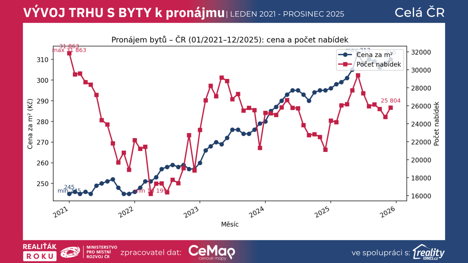 Pětiletý vývoj nájmů v ČR ukazuje stabilní trend: nájemní bydlení zdražuje a zároveň se pronajímá rychleji. Cena se posunula z 245 Kč/m² (01/2021) na 310 Kč/m² (12/2025), tedy o +26,5 %, přičemž vrchol nájemního „píku“ v našem období přišel v 06/2025 (317 Kč/m²). Zároveň se zkrátila průměrná doba nabízení z 63 dní (01/2021) na 39 dní (12/2025), což je –38,1 % – jasný signál, že kvalitní byty mizí z trhu rychleji než dřív.