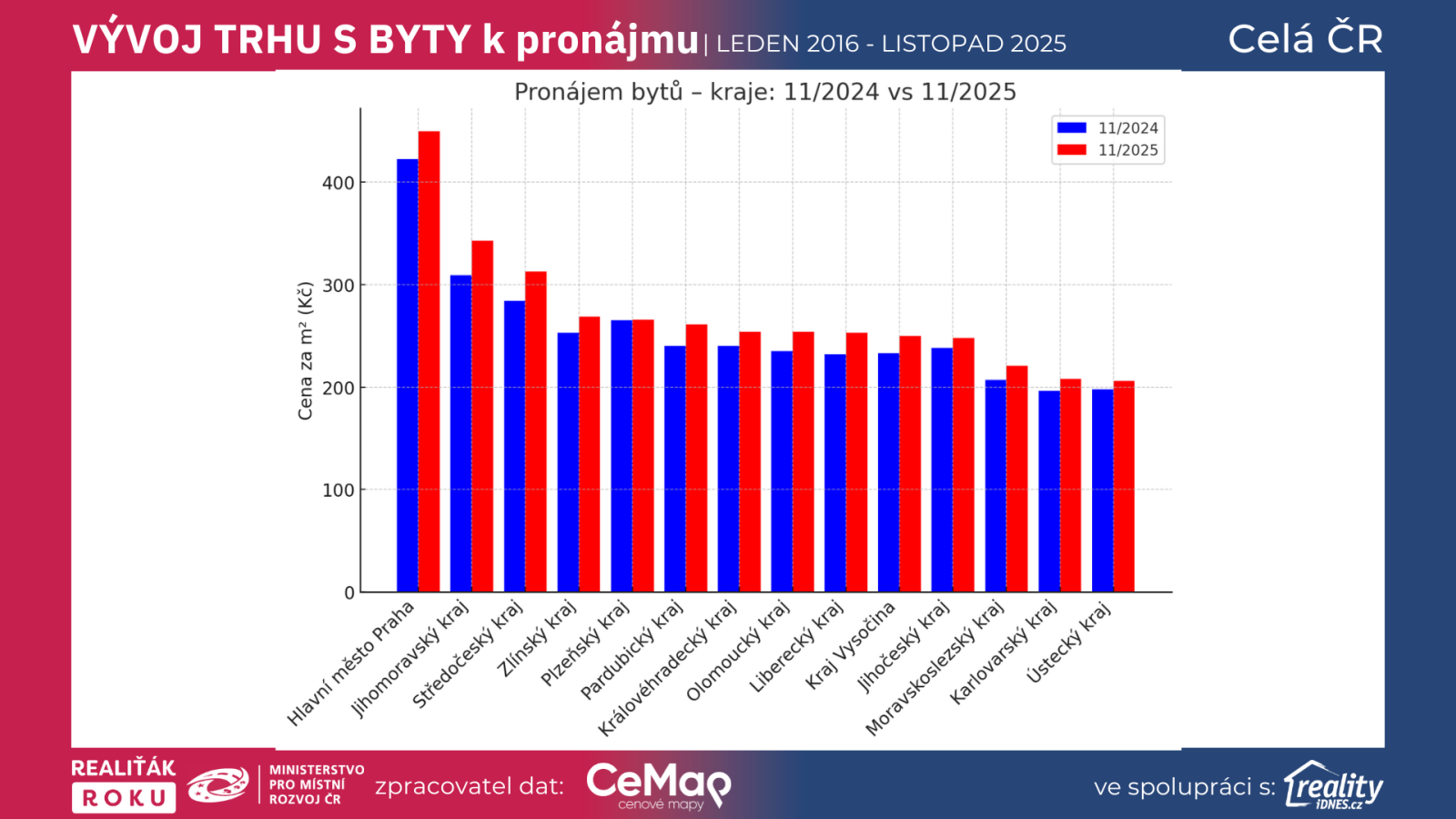 Nájemnímu bydlení v České republice za posledních 12 měsíců dominuje silný růst cen, rychlé obsazování bytů a pokles nabídky. Mezi listopadem 2024 a listopadem 2025 vzrostla cena nájemného z 308 Kč/m² na 346 Kč/m² (+12,4 %), zatímco počet dostupných bytů klesl o 17 %. Doba pronájmu spadla z 41 na 26 dní, což je nejnižší hodnota od roku 2018.
