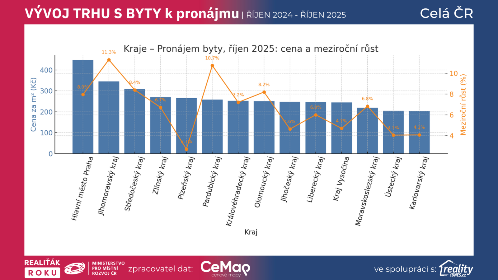 Nájemní trh v roce 2025 je vlastně nejupřímnější část realitního trhu. U prodejů lidi pořád trochu taktizují, u pozemků se vyčkává, u developerských projektů se řeší DPH a fáze stavby – ale u nájmů se ukazuje čistá realita: když je byt dobře připravený, zmizí. A naše říjnová čísla to dokazují: 308 Kč/m² republikově, 25,5 tisíce nabídek a přitom jen 23 dní v inzerci. To není „přehřátí“, to je prostě živý trh. Znamená to, že lidé nájem berou jako normální formu bydlení, ne jako ostudu nebo nouzovku. To je velký společenský posun oproti době před deseti lety.