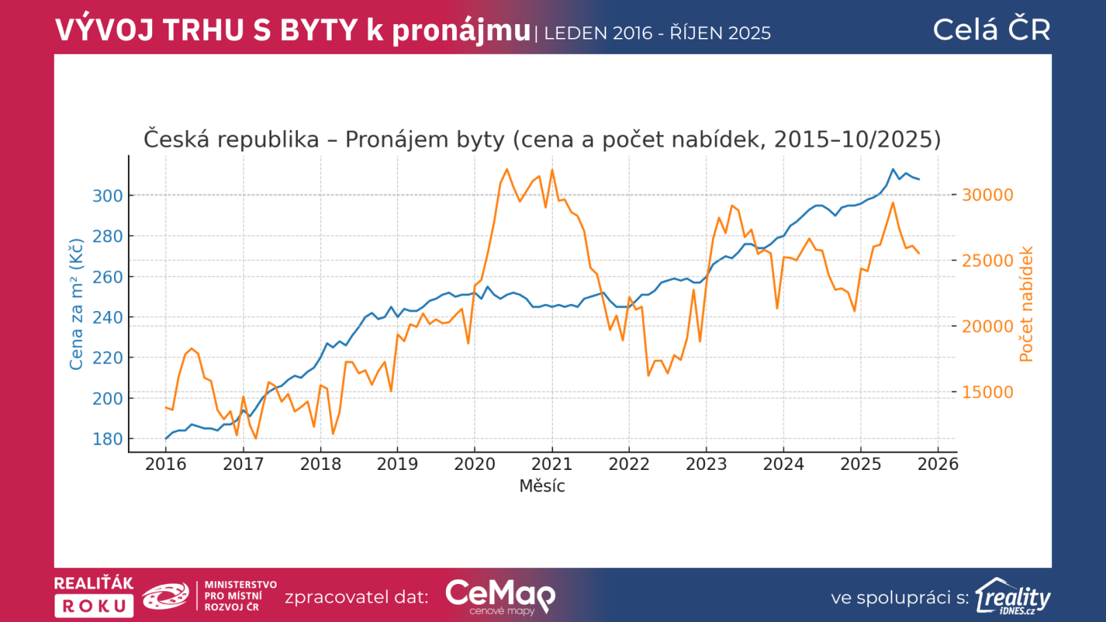 Nájemní bydlení v Česku se v roce 2025 nechovalo tak, jak hodně lidí čekalo. Místo zlevnění po silném roce 2024 jsme v říjnu 2025 na celorepublikové hodnotě 308 Kč/m², tedy výš než před rokem (294 Kč/m² v 10/2024), ale hlavně – byty k pronájmu se pronajímají rychleji. Počet aktivních nabídek přitom není malý: 25 519 nájemních bytů v říjnu 2025 a průměrná doba inzerce jen 23 dní. Trh tak ukazuje, že nájem je dnes pro hodně domácností první volba, ne nouzové řešení.