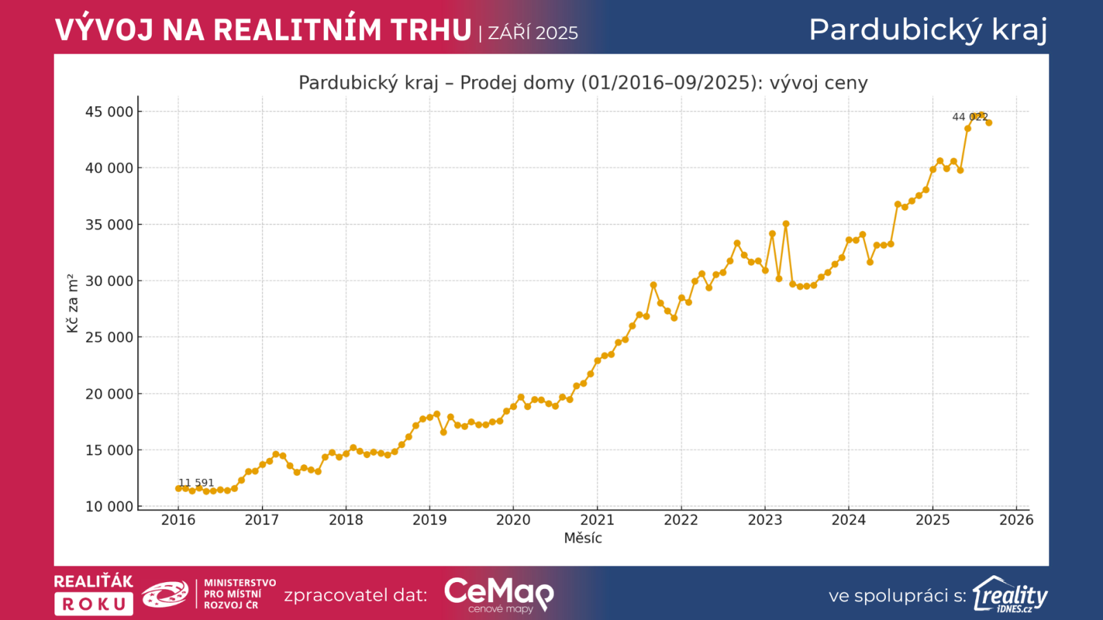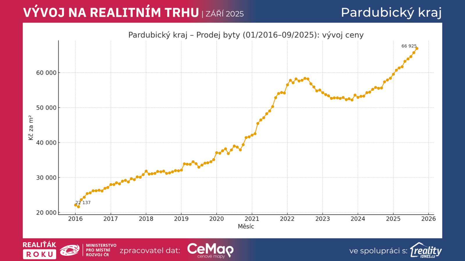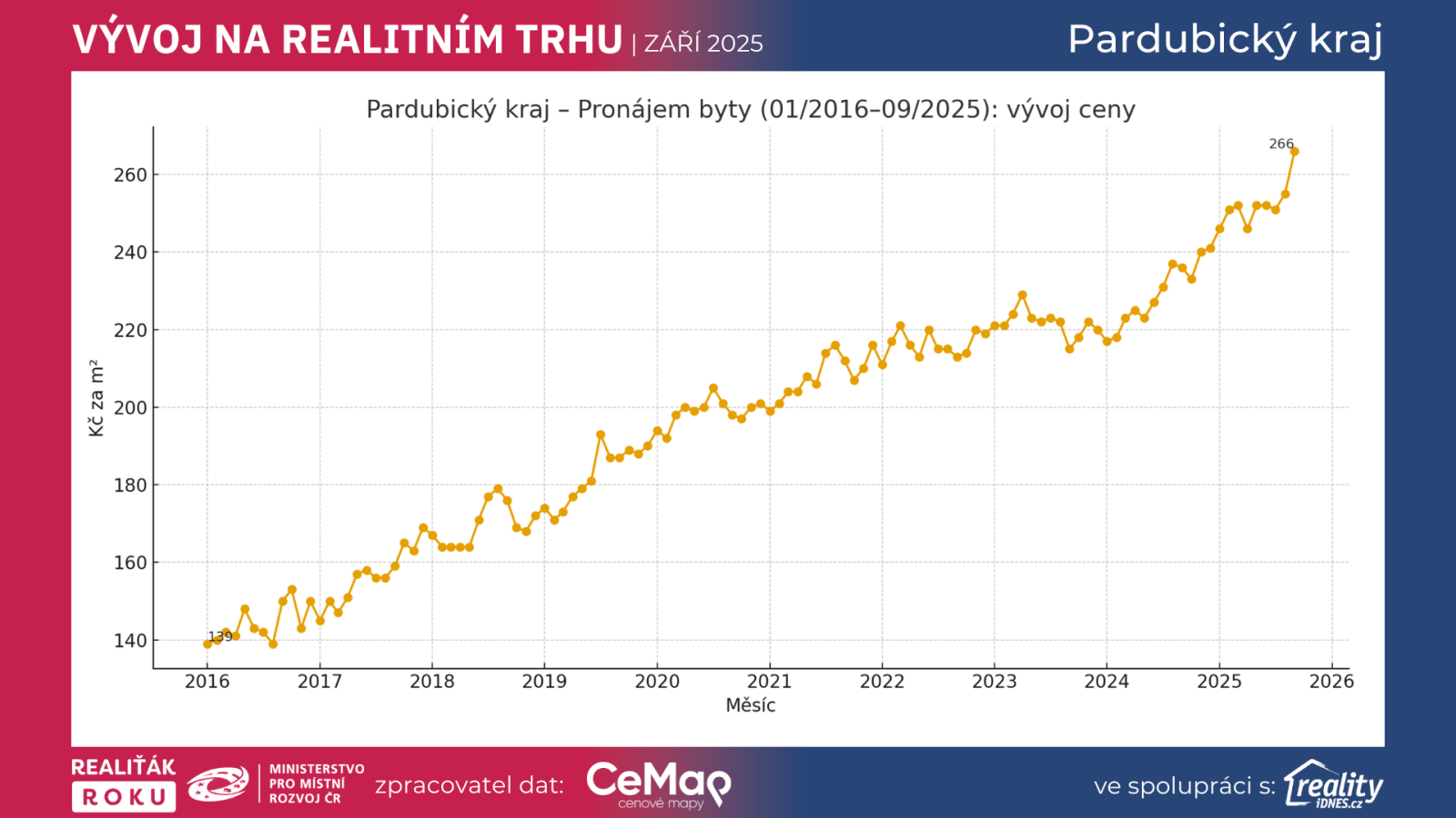 V Pardubickém kraji v září 2025 výrazně zrychlily prodeje i nájmy. Byty na prodej dosáhly 66 925 Kč/m² (09/2025), meziročně z 55 617 Kč/m² (+20,33 % YoY), proti 09/2022 (56 832 Kč/m²) jde o +17,76 %. V nabídce bylo 707 bytů, doba inzerce 56 dní. Nájemní byty stojí 266 Kč/m² (+12,71 % YoY, 09/2024: 236 Kč/m²; 09/2022: 213 Kč/m² / +24,88 %), 616 nabídek, 18 dní inzerce. Domy na prodej vyskočily na 44 022 Kč/m² (09/2024: 36 548 Kč/m² / +20,45 % YoY; 09/2022: 33 355 Kč/m² / +31,98 %), při 1 575 nabídkách a 99 dnech inzerce.