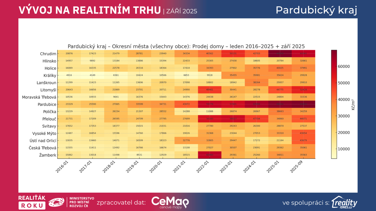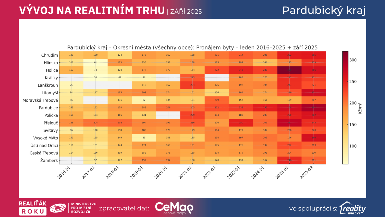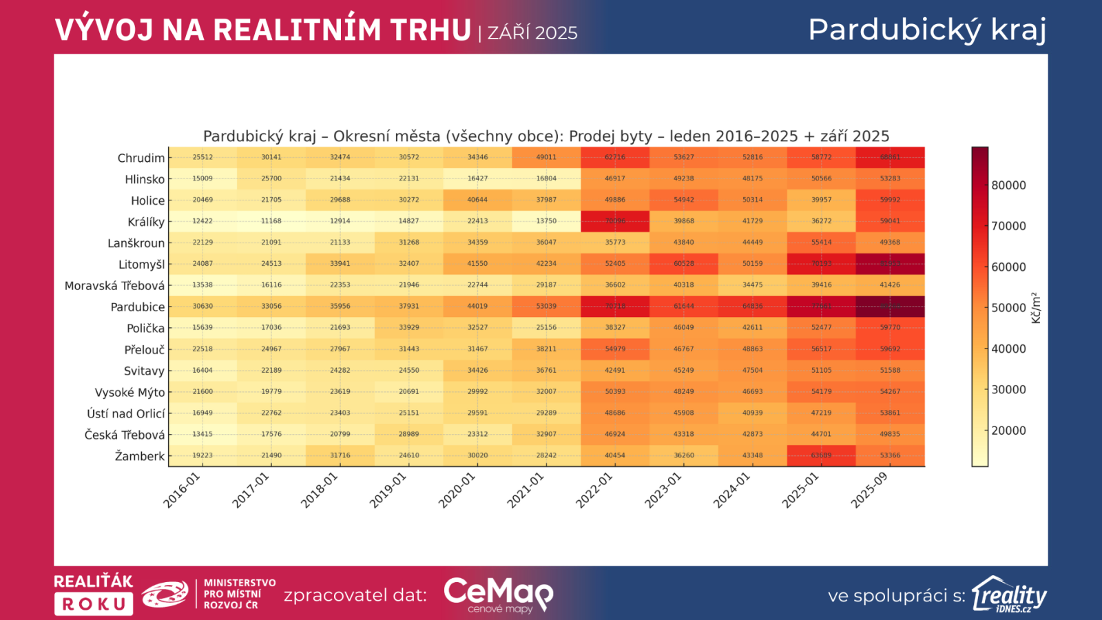 Shrnutí jednou větou: Pardubický kraj má v 09/2025 rychlý a rostoucí trh: byty 66 925 Kč/m² (+20,33 % YoY), nájmy 266 Kč/m² (+12,71 % YoY), domy 44 022 Kč/m² (+20,45 % YoY). Pardubice dominují, ale Litomyšl, Chrudim a Přelouč výrazně dohánějí, zatímco Vysoké Mýto a Ústí nad Orlicí předvádějí u domů nejprudší roční růsty. Pro prodávající je to silné okno, pro kupující hra na rychlost a kvalitu, pro investory čitelný výnos s minimální volatilitou nájmů.