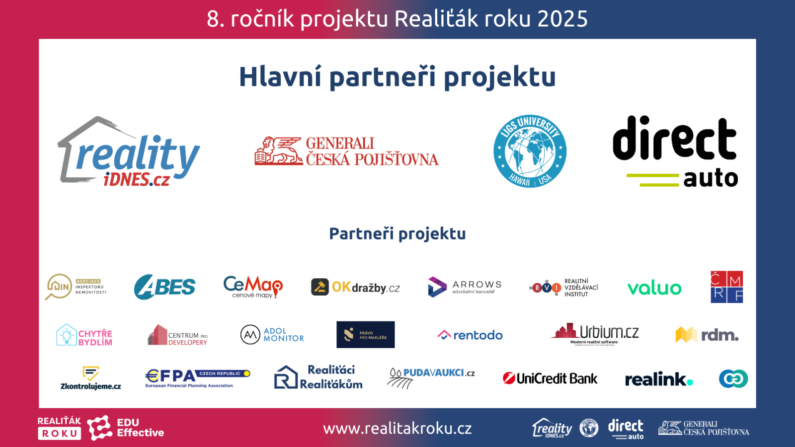 Partnerům projektu Realiťák roku 2025 patří poděkování nejen za finanční či odbornou podporu, ale především za aktivní zapojení do kultivace realitního trhu. Každý partner přispěl svým dílem k tomu, aby projekt mohl fungovat jako důvěryhodná a respektovaná platforma pro odbornou i laickou veřejnost.