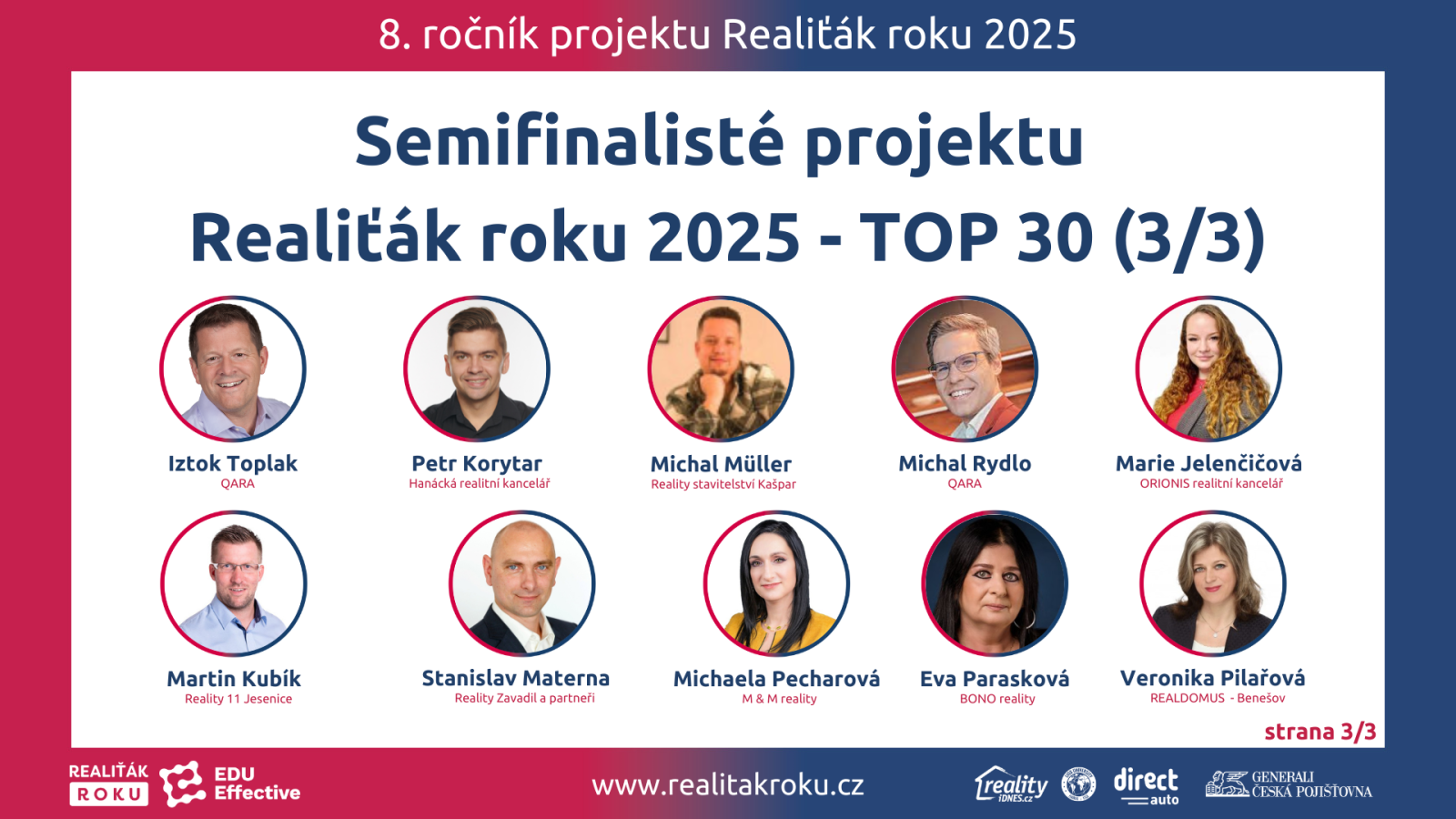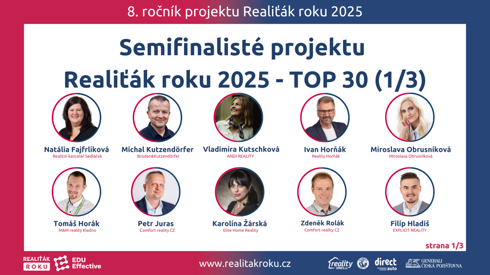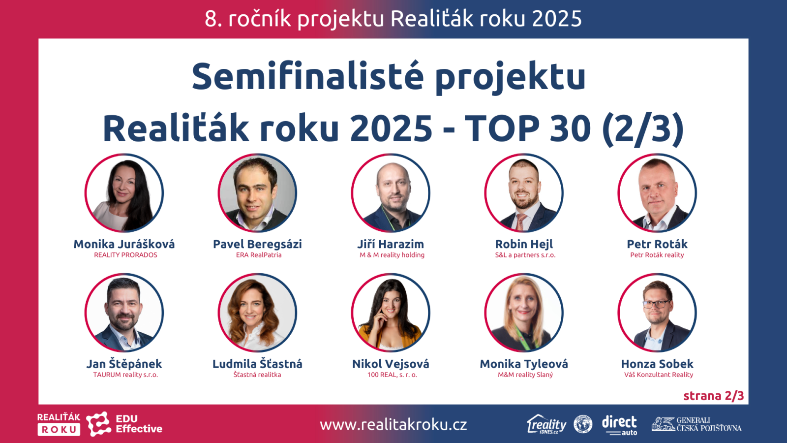 Semifinálová třicítka je skvělou zprávou pro klienty napříč ČR: jasný seznam prověřených profesionálů, kteří umí spojit výkon s etikou. „Cílem projektu je zvýšit povědomí o důležitosti kvalifikovaných a etických makléřů – to je základ důvěry a stability trhu,“ připomíná Monika Lukášová, ředitelka Projektu Realiťák roku. Jak doplňuje Petr Makovský: „Semifinalisté ukazují, že realitní služba může být špičková a zároveň lidská. Teď se rozhodne, kdo si udrží laťku nejvýš nejen ve finálovém testu.“