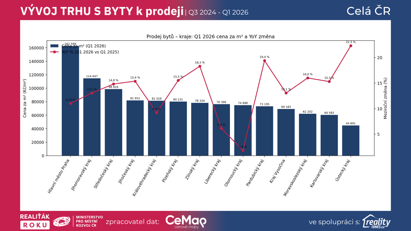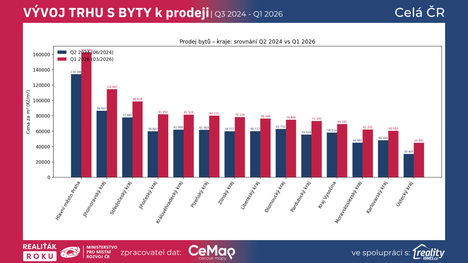 Grafy a data jsou ověřené exkluzivní data projektu Realiťák roku ve spolupráci CEMAP - cenové mapy a portálu Reality.iDNES.cz spolu s Ministerstvem pro místní rozvoj
