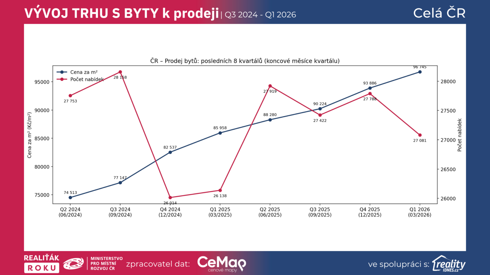 Pohled na posledních 8 kvartálů ukazuje velmi silný posun českého trhu s byty k prodeji. V celé ČR se Cena za m² zvýšila z 74 513 Kč/m² (Q2 2024 / 06/2024) na 96 745 Kč/m² (Q1 2026 / 03/2026), tedy o +29,84 %. Ještě výraznější je změna v rychlosti trhu: Doba nabízení se zkrátila ze 141 dní na 58 dní, což znamená pokles o −58,87 %. Nabídka zůstává vysoká, ale právě v Q1 2026 je z dat zřejmé, že dobře nastavené byty se prodávají podstatně rychleji než před rokem a půl.