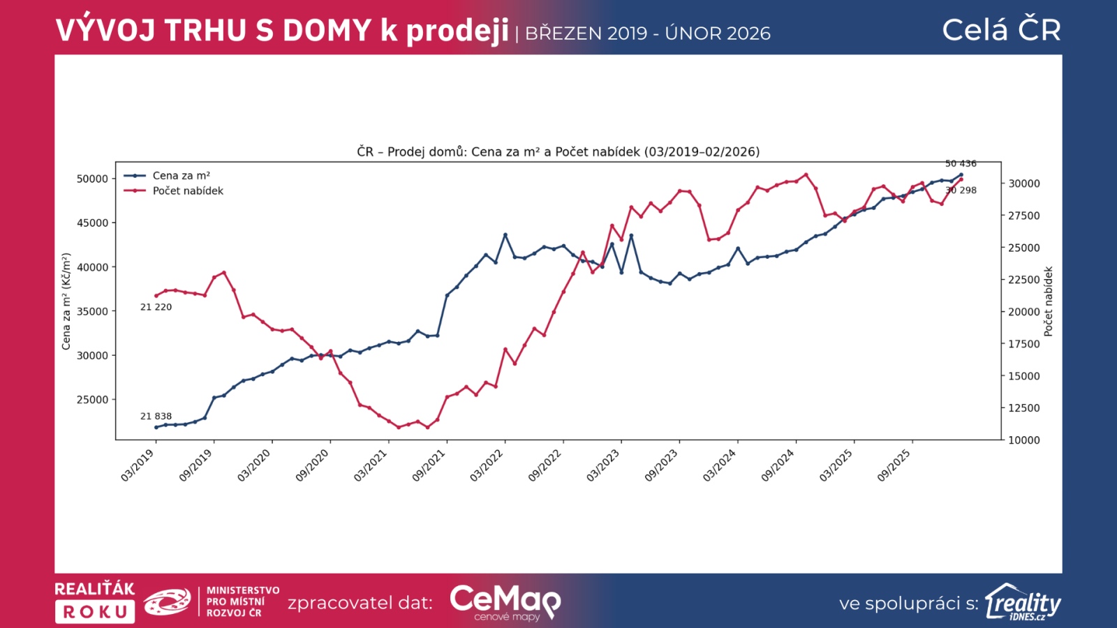 Rodinné domy za posledních 7 let zdražily výrazněji než mnoho lidí čekalo – a současně se měnila rychlost prodeje v jednotlivých fázích trhu. V celé ČR vzrostla u prodeje domů Cena za m² z 21 838 Kč/m² (03/2019) na 50 436 Kč/m² (02/2026), tedy o +130,96 %. Počet nabídek se zvýšil z 21 220 (03/2019) na 30 298 (02/2026) (+42,78 %).