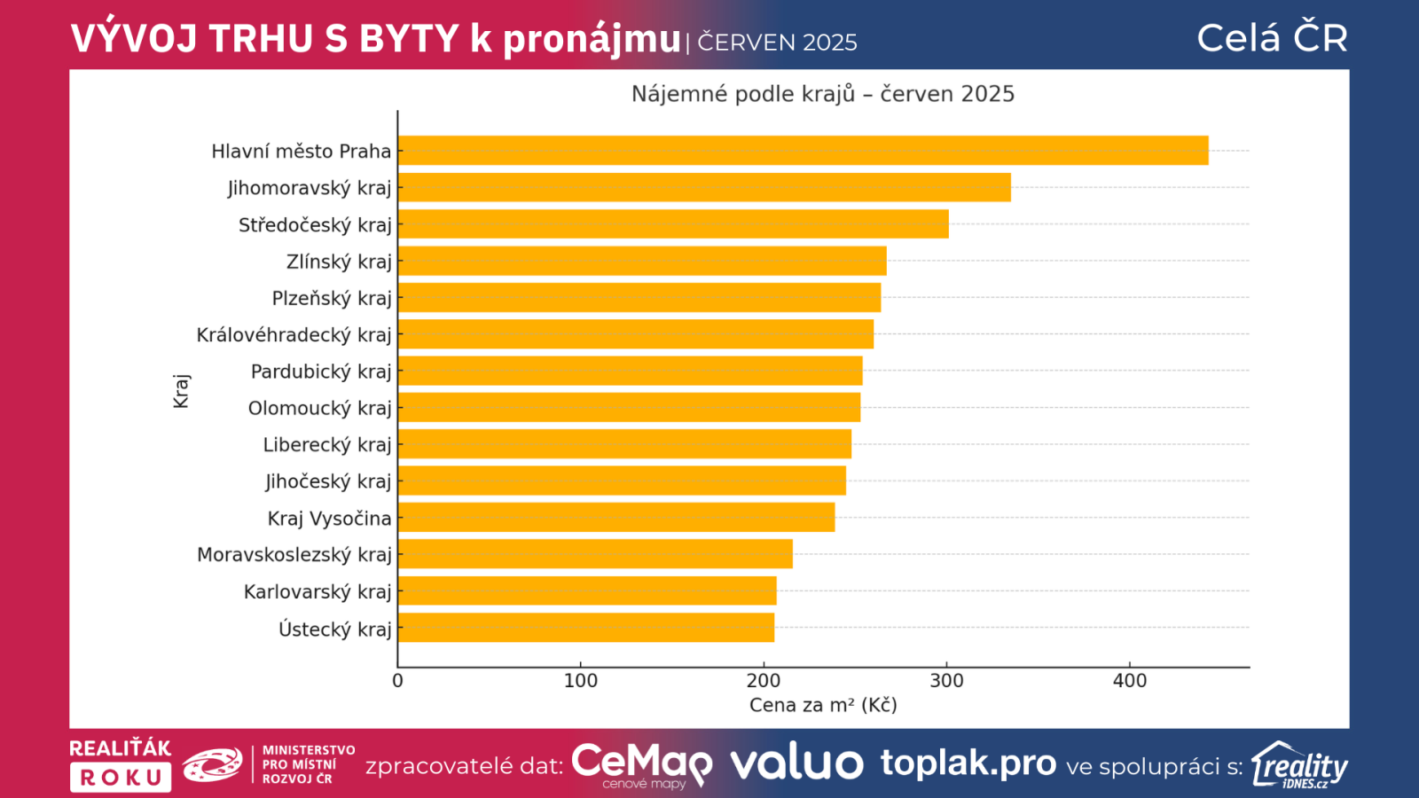 Rozdíly v nájemním bydlení mezi kraji České republiky nikdy nebyly tak výrazné. Podle červnových dat z roku 2025 platí Pražané za nájem v průměru 443 Kč za metr čtvereční, zatímco v Ústeckém kraji je to jen 206 Kč. Do popředí se ale rychle dostávají i Jihomoravský a Středočeský kraj, které se cenově přibližují hlavnímu městu.