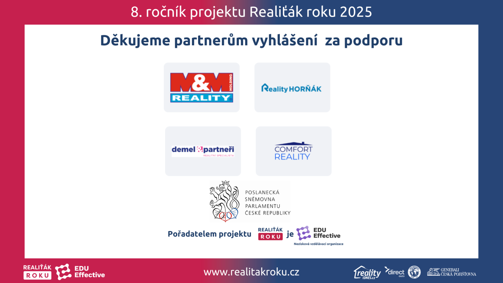 Osmý ročník opět ukázal, že kvalitní realitní služba stojí na profesionalitě, etice, odpovědnosti a důvěře. Děkujeme odborné porotě, partnerům, podporovatelům i veřejnosti za to, že společně pomáháme kultivovat realitní trh v České republice.
