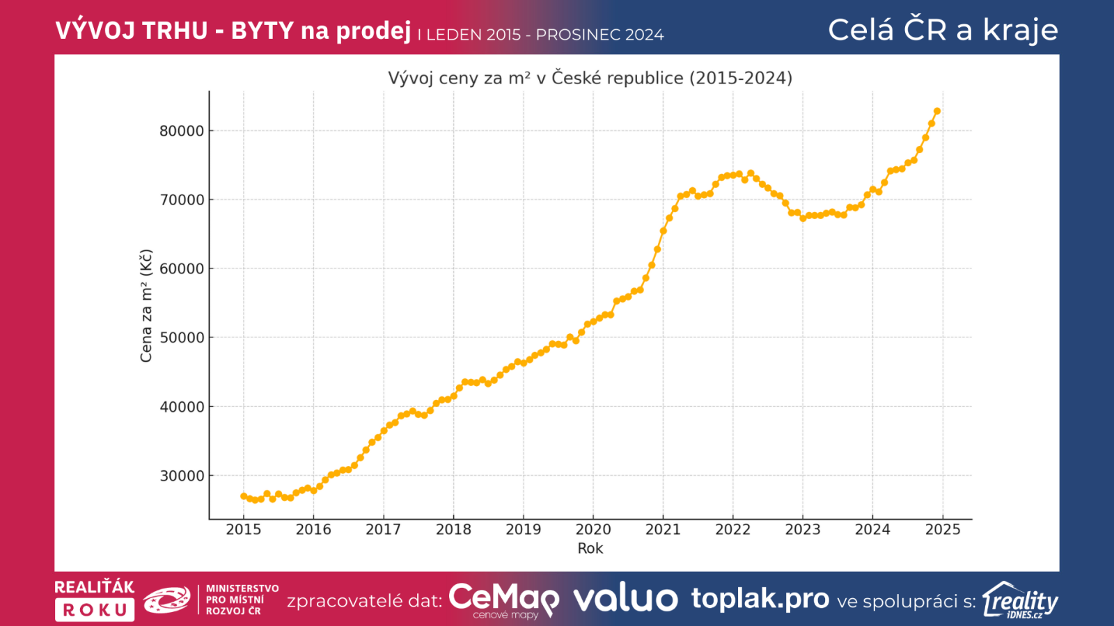 Ceny bytů v České republice za posledních 10 let dramaticky vzrostly. Průměrná cena za m² se zvýšila z 26 990 Kč v lednu 2015 na 82 776 Kč v prosinci 2024, což představuje nárůst o 207 %. Nejvyšší ceny vykazuje Praha, kde se pohybují nad 130 000 Kč/m², zatímco Karlovarský kraj dosahuje nejnižších cen okolo 35 000 Kč/m². Poptávka po bytech výrazně převyšuje nabídku, což vede k dalšímu růstu cen.