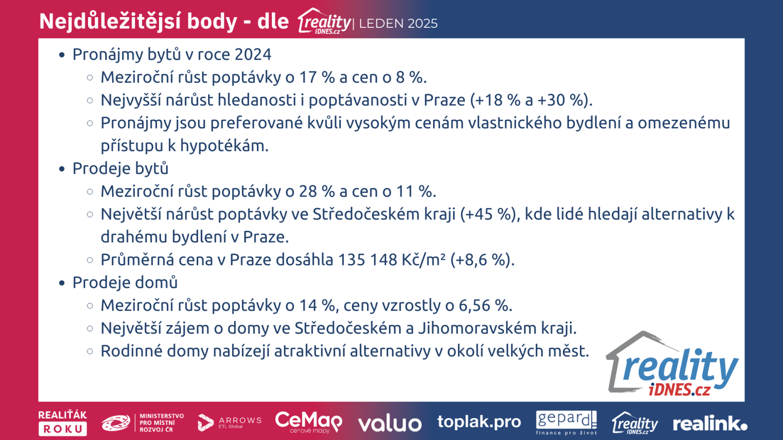 Rok 2024 přinesl na českém trhu nemovitostí oživení poptávky po prodejích bytů i domů, zejména ve Středočeském a Jihomoravském kraji. Poptávka po bytech vzrostla o 28 % a ceny se zvýšily průměrně o 11 %. Přetrvávající nedostatek nových developerských projektů a zvolna klesající hypoteční sazby přispěly k vyšším cenám. Pronájmy zůstávají populární volbou, zejména mezi mladými lidmi a zahraničními pracovníky, kdy poptávka vzrostla o 17 % a ceny nájmů o 8 %.