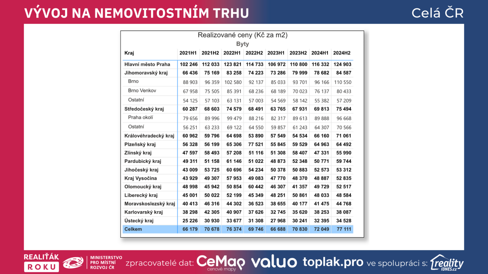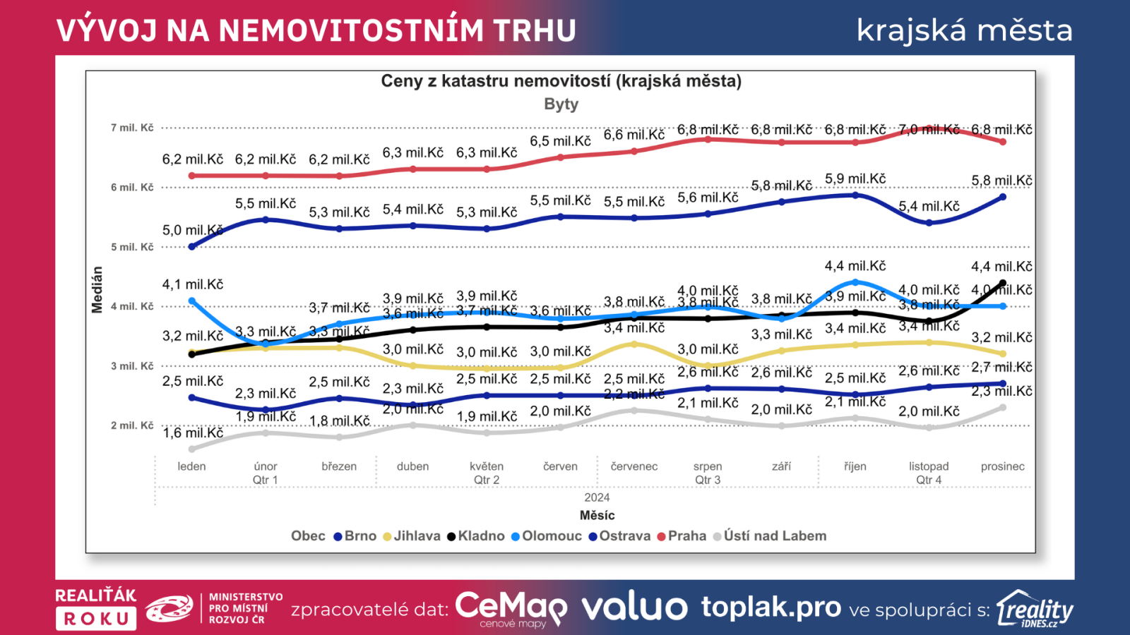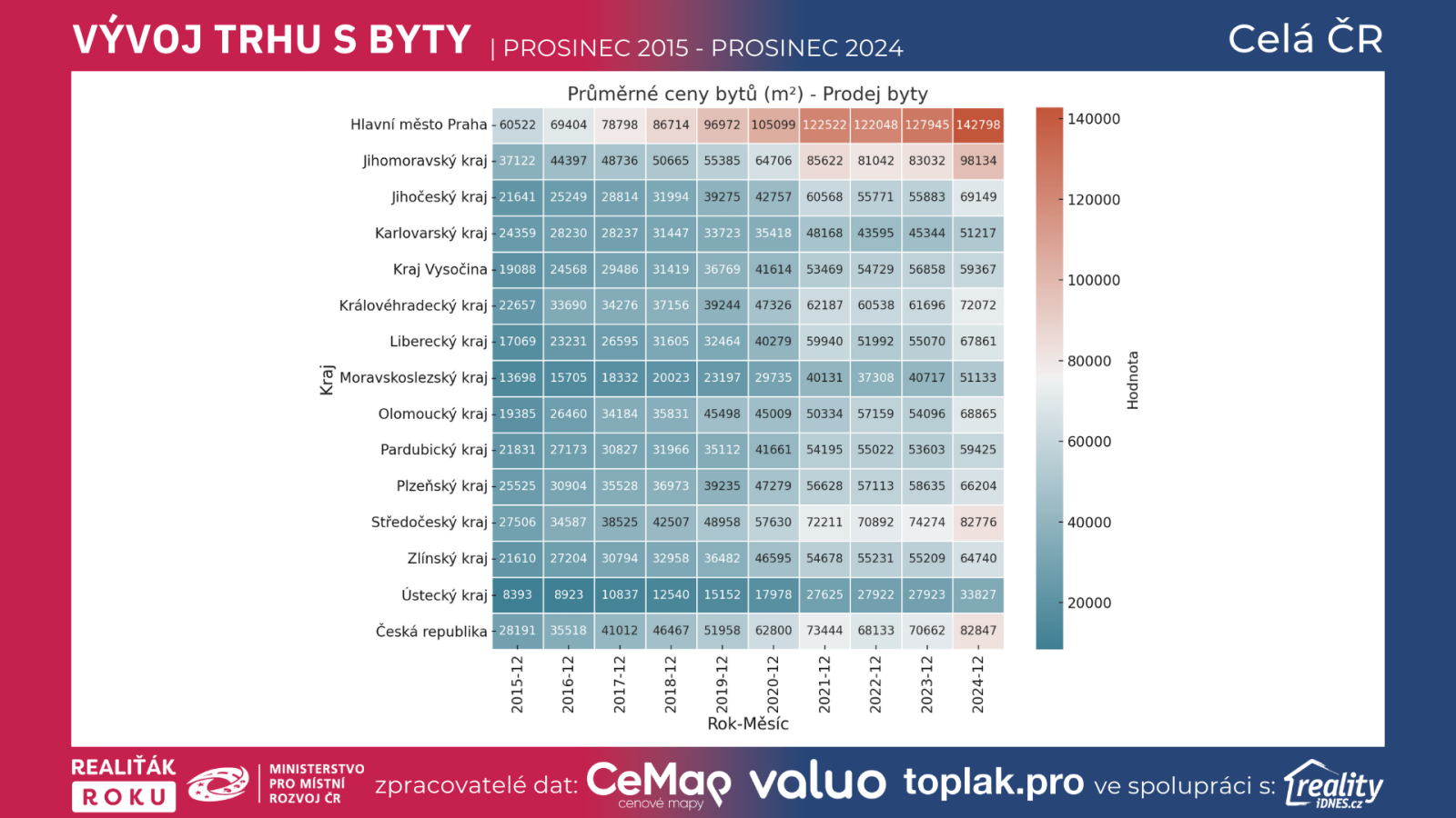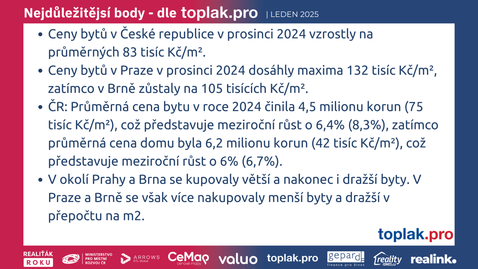 Podle TOPLAK.PRO dosáhla průměrná cena za m² bytů v prosinci 2024 rekordních 83 tisíc Kč, zatímco průměrná cena bytu činila 5 milionů Kč. Nejvyšší růst byl zaznamenán v okolí Prahy a Brna (+8,3 %), přičemž Praha překonala hranici 132 tisíc Kč/m². Brno zaznamenalo mírný pokles na 105 tisíc Kč/m², s průměrnou cenou bytu 6,5 milionu Kč.