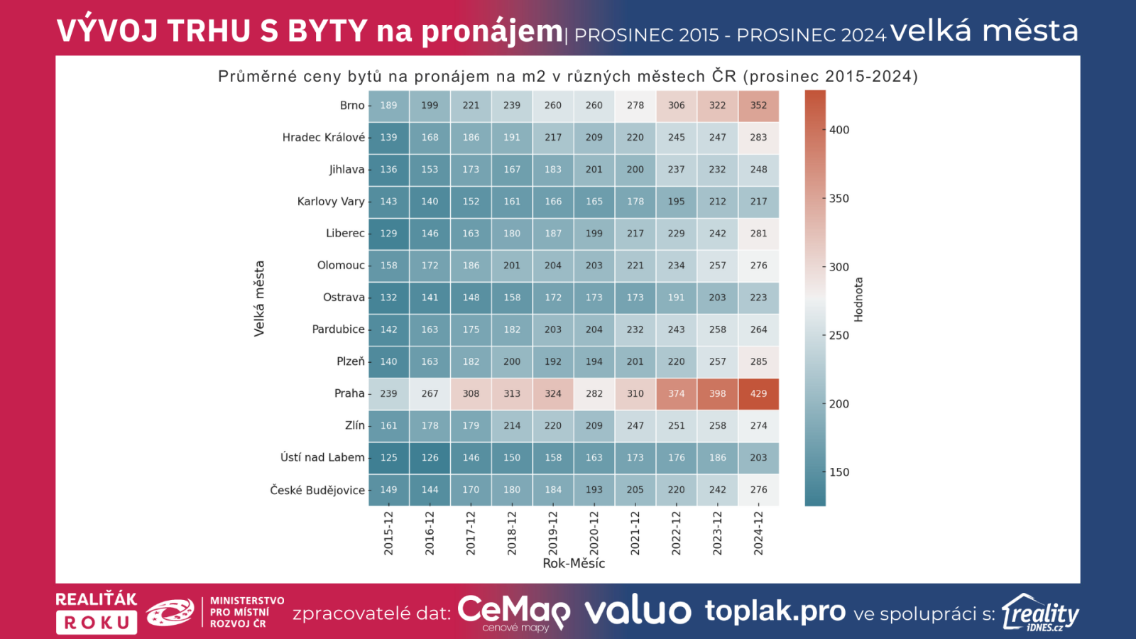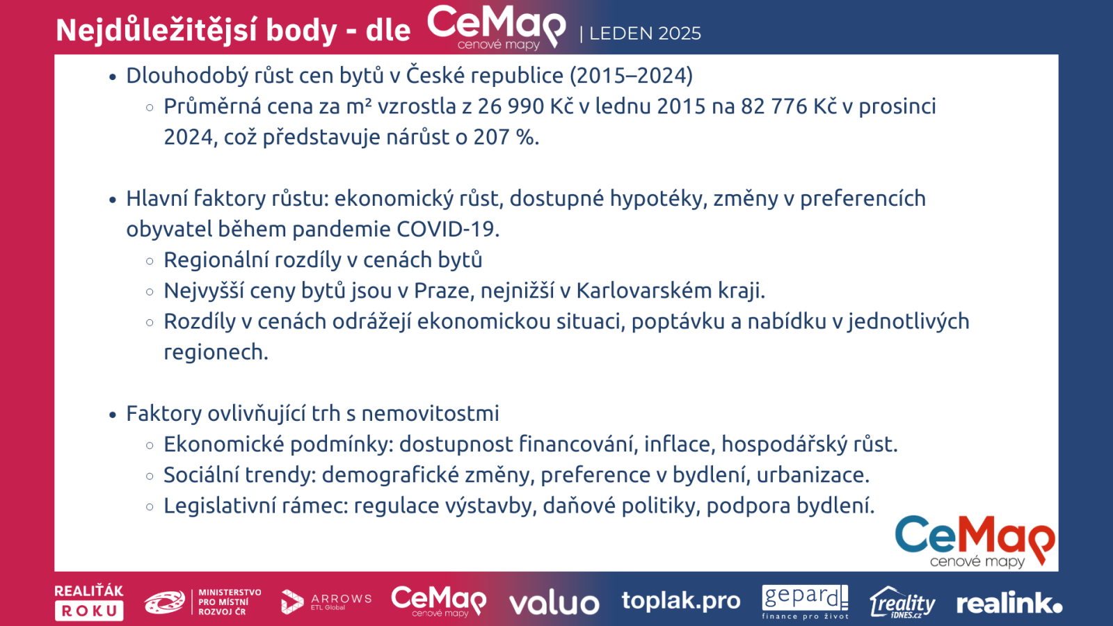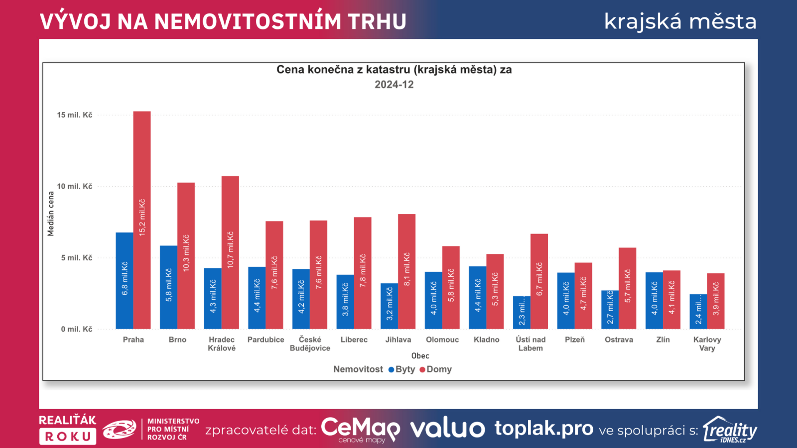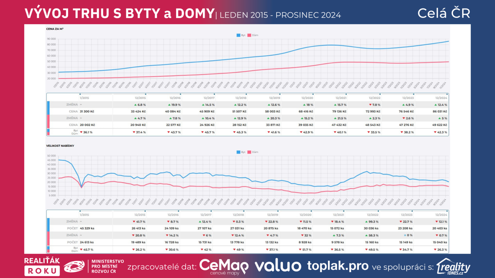 Podle TOPLAK.PRO dosáhla průměrná cena za m² bytů v prosinci 2024 rekordních 83 tisíc Kč, zatímco průměrná cena bytu činila 5 milionů Kč. Nejvyšší růst byl zaznamenán v okolí Prahy a Brna (+8,3 %), přičemž Praha překonala hranici 132 tisíc Kč/m². Brno zaznamenalo mírný pokles na 105 tisíc Kč/m², s průměrnou cenou bytu 6,5 milionu Kč.