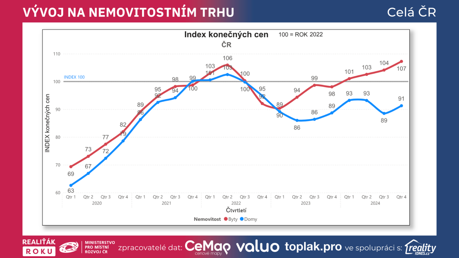 Ceny bytů v České republice dosáhly v roce 2024 historického maxima, kdy průměrná cena za m² činila 82 776 Kč, což je nárůst o 207 % od roku 2015. Nejvyšší ceny vykazuje Praha, kde přesahují 130 000 Kč/m², zatímco Karlovarský kraj zůstává nejlevnější. Nedostatečná výstavba a nízký objem rekonstrukcí přispívají k růstu cen, přičemž poptávku zvyšují také investoři. Fotovoltaické panely na nemovitostech se staly běžnější.