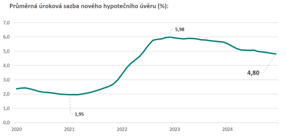 V roce 2024 dosáhl objem nově poskytnutých hypotečních úvěrů 226 miliard Kč, přičemž průměrná výše úvěru vzrostla na 3,87 milionu Kč. Klíčovým faktorem byla pozvolná stabilizace úrokových sazeb, které na konci roku dosáhly průměrné hodnoty 4,80 %. Tento vývoj reflektuje větší důvěru klientů i pružnost bank.