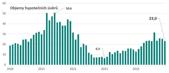 Objem poskytnutých hypotečních úvěrů v prosinci minulého roku dosáhnul na bezmála 23 mld. Kč, z čehož asi 19,7 mld. Kč činily nově poskytnuté úvěry. Zbylou část, tedy asi 3,2 mld. Kč tvořily refinancované hypotéky.
