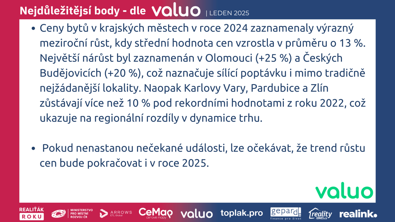 Střední hodnota cen bytů v krajských městech vzrostla podle VALUO.cz meziročně o 13 %, přičemž nejvyšší nárůst zaznamenaly Olomouc (+25 %) a České Budějovice (+20 %). Praha, Brno a další klíčová města překonala cenová maxima z roku 2022, zatímco Karlovy Vary, Pardubice a Zlín zůstávají pod touto úrovní.
