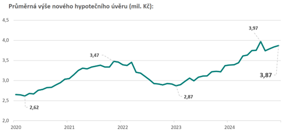 Jak jsem již naznačil výše, během roku významně vzrostla průměrná výše hypotečního úvěru. Ta před rokem činila asi 3,37 mil. Kč a během roku 2024 vzrostla až na 3,87 mil. Kč a blíží se tak hranici čtyř milionů. V růstu průměrné hypotéky se tak odráží jak zvýšená sebedůvěra klientů, tak i větší apetit ze strany bank.