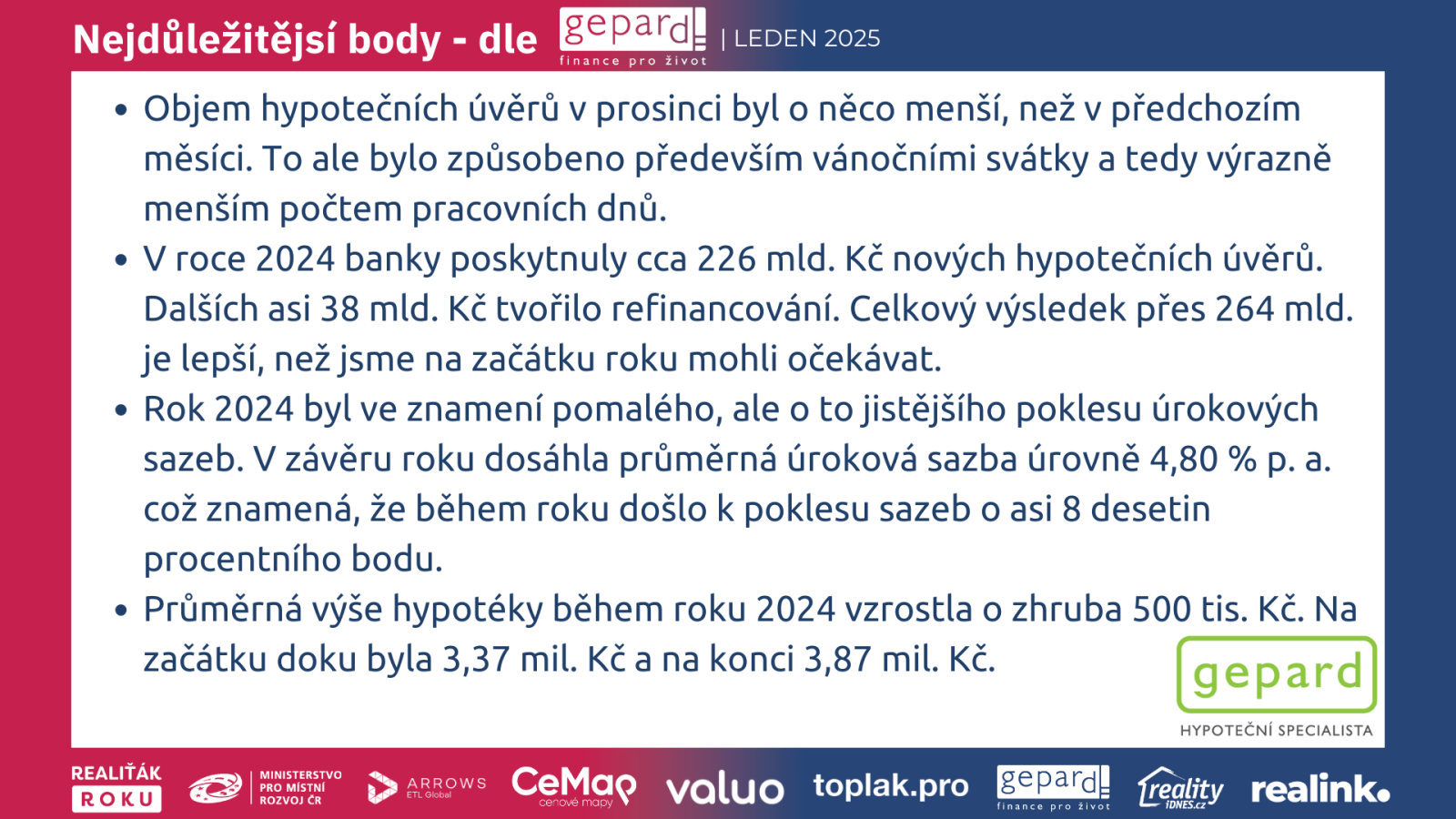 Pokud se ohlédnu za celým rokem 2024, musím přiznat, že jeho výsledek je nakonec o dost lepší, než bych si na jeho začátku troufnul doufat. Banky během roku poskytnuly nové hypoteční úvěry v objemu přes 226 mld. Kč, což je velmi pěkný výsledek.