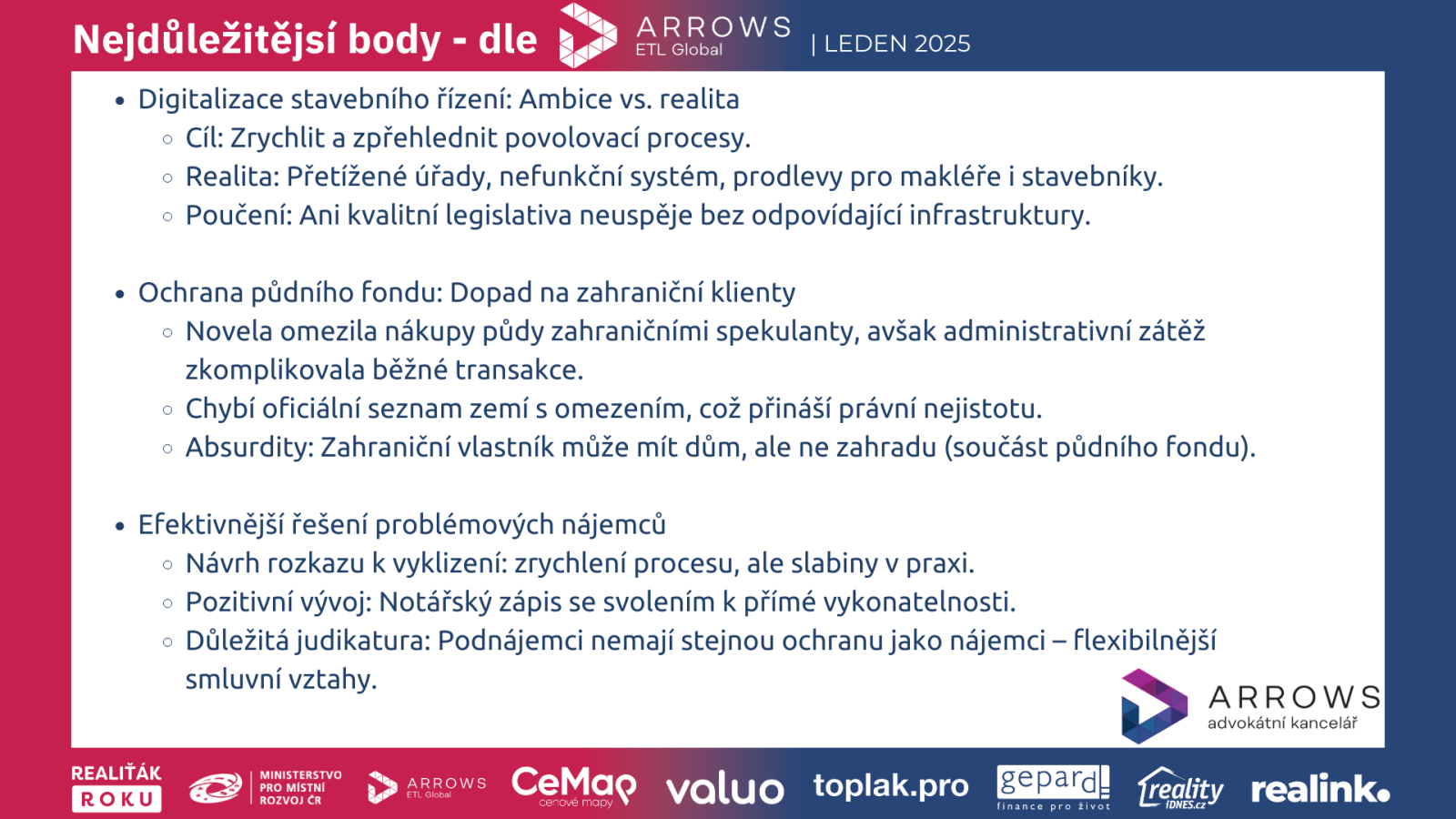 Rok 2024 přinesl významné legislativní změny v oblasti realitního práva, ale očekávané zjednodušení procesů se v praxi často nepotvrdilo. Digitalizace stavebního řízení zpomalila povolovací procesy, což znamenalo více práce pro makléře asistující při developmentu. Komplikace přinesla i novela zákona o ochraně zemědělského půdního fondu, která přidala administrativní zátěž a ztížila transakce zahrnující zahrady.