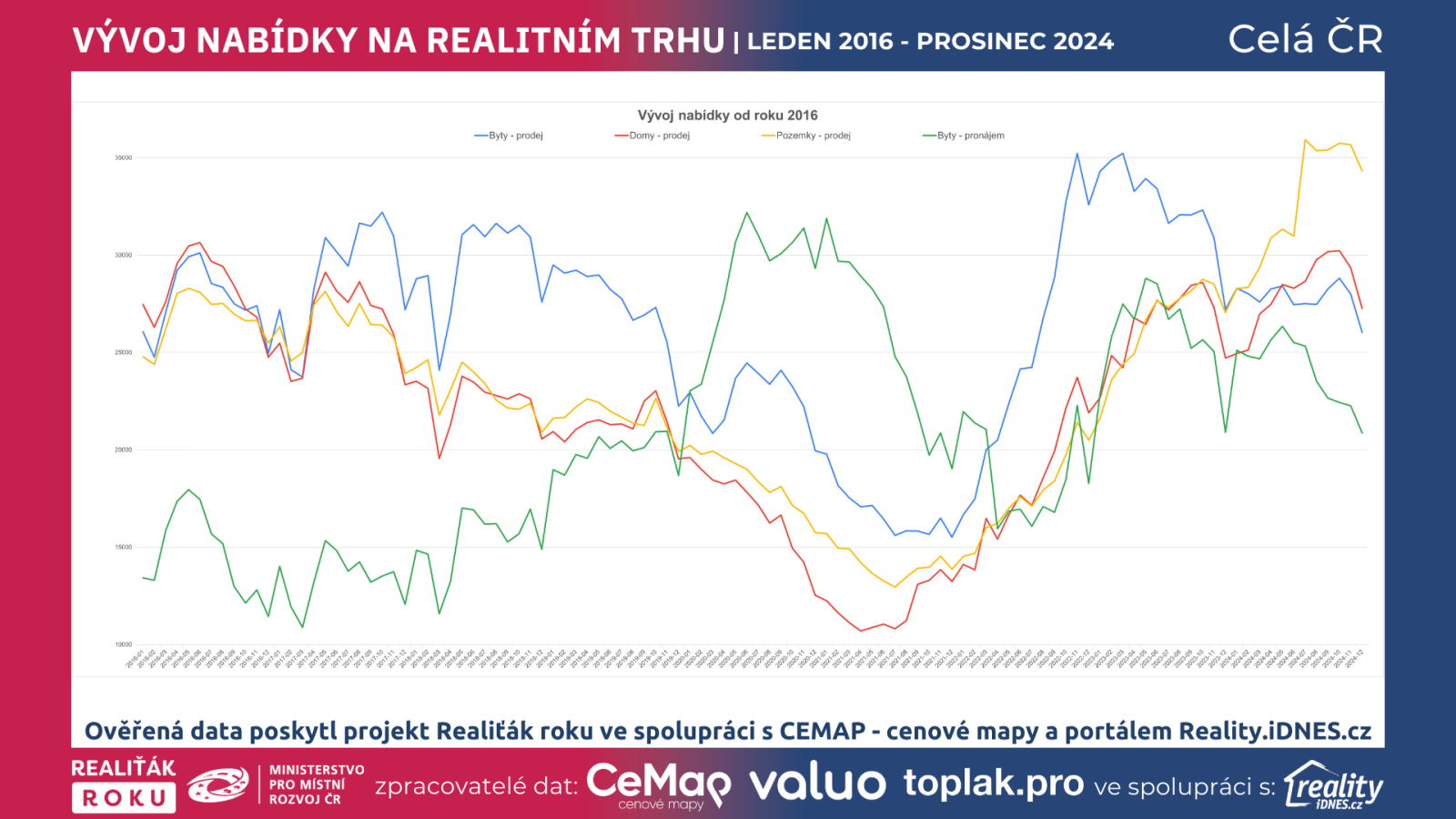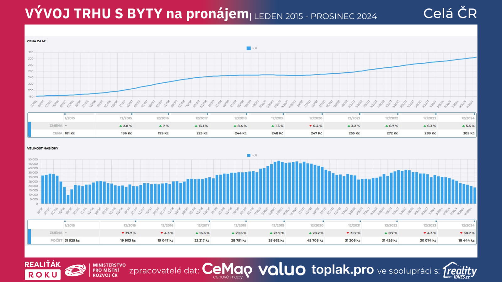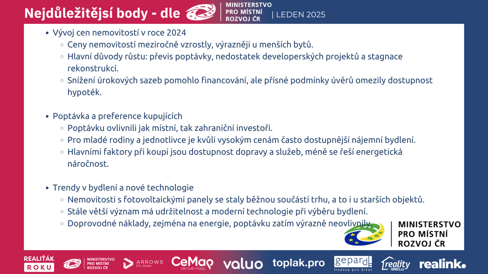 V roce 2024 pokračoval růst cen nemovitostí, zejména u menších bytů, což bylo způsobeno převisem poptávky ve velkých městech a atraktivních lokalitách. „Hlavním faktorem růstu cen je omezený počet nových developerských projektů a nízký objem rekonstrukcí starších nemovitostí,“ uvádí Pavel Rakouš, vedoucí oddělení realitní činnosti na Ministerstvu pro místní rozvoj. Mírné snížení úrokových sazeb sice zlepšilo financování, ale přísná kritéria pro hypotéky omezují přístup mladých rodin k vlastnickému bydlení, čímž roste zájem o nájemní nemovitosti.