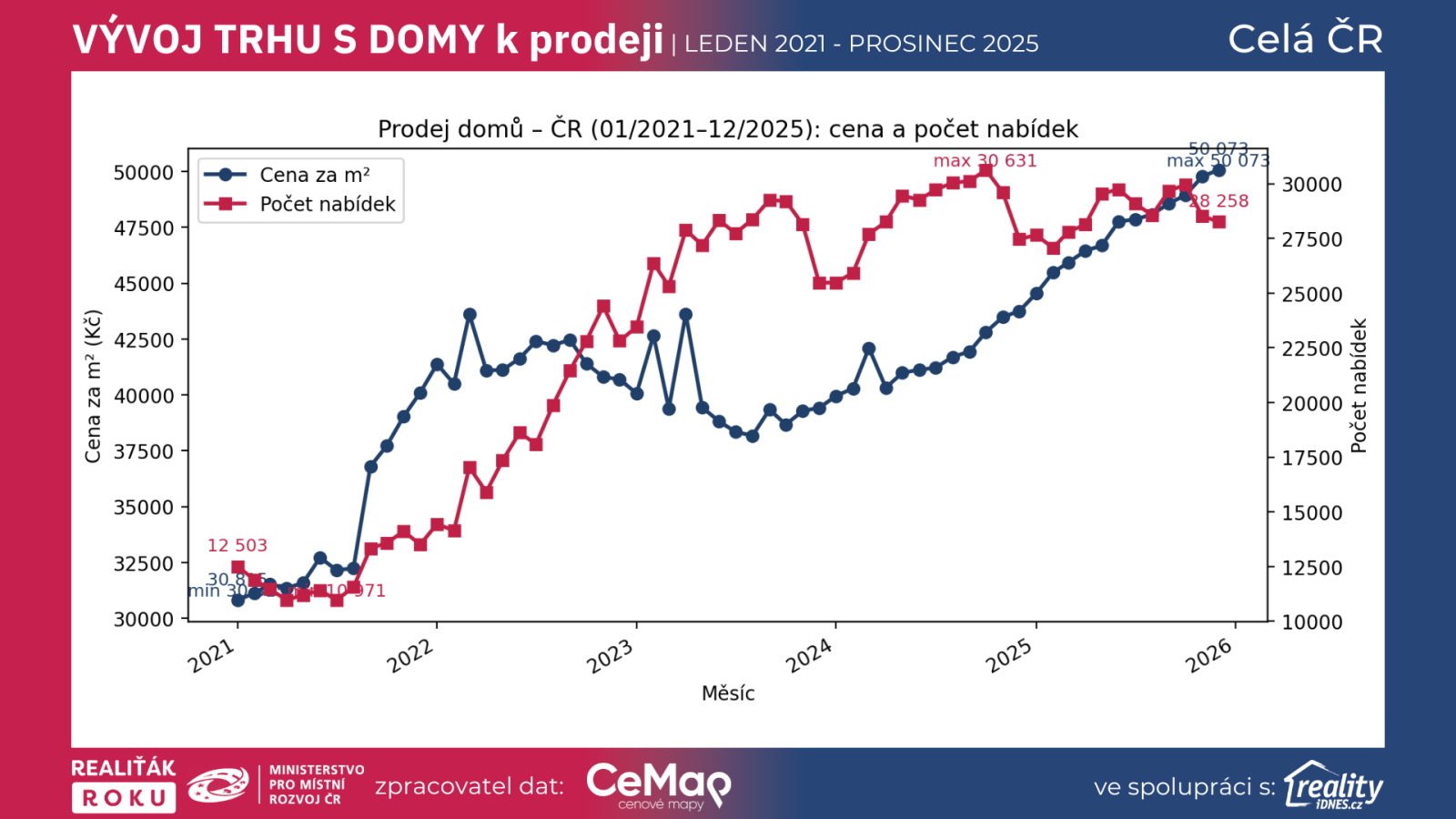 Pětiletý pohled na prodej rodinných domů je příběhem dvou sil: výrazného zdražení a proměnlivé (ale nyní opět rychlejší) likvidity trhu. V celé ČR se cena posunula z 30 815 Kč/m² (01/2021) na 50 073 Kč/m² (12/2025), tedy o +62,5 %, přičemž absolutní maximum v našem pětiletém okně přišlo právě v 12/2025. To samo o sobě říká, že domy zůstávají pro české domácnosti i investory dlouhodobě atraktivní — a že trh je ochotný „platit“ za prostor, lokalitu a jistotu.