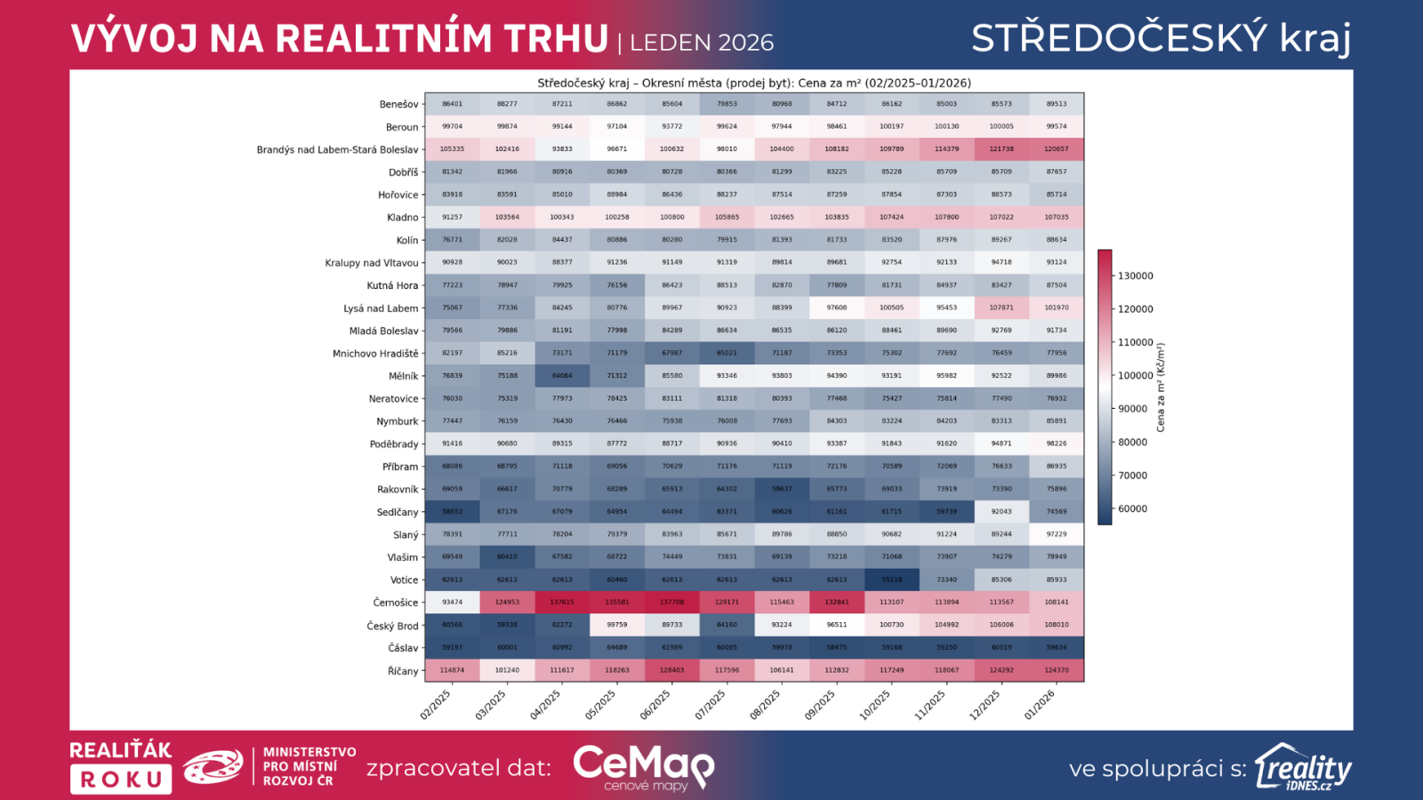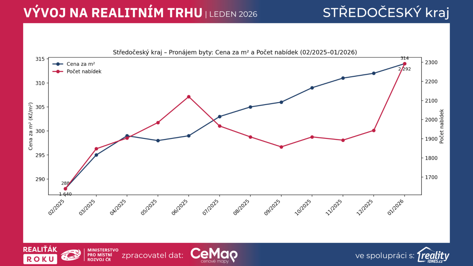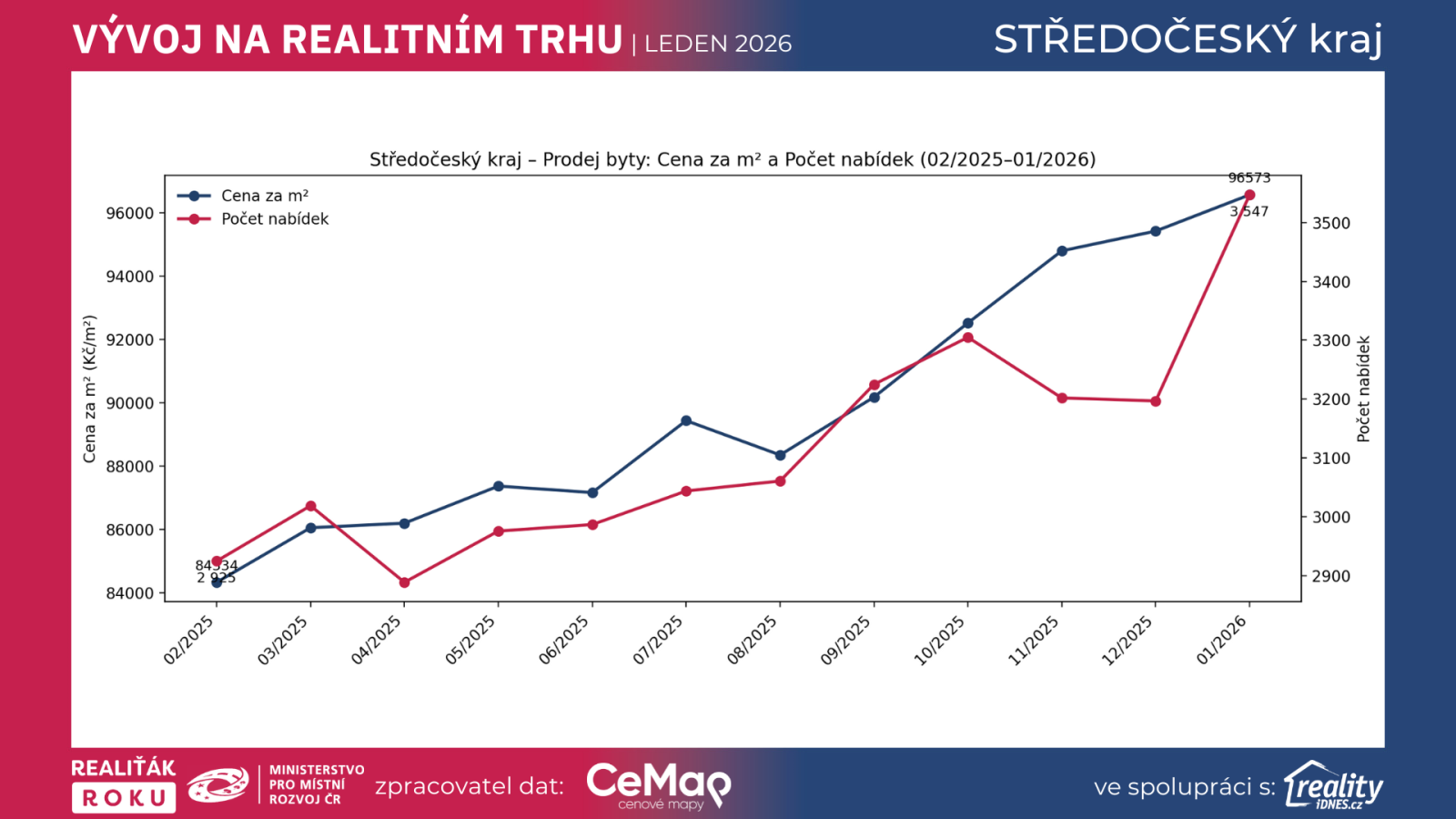 Středočeský kraj potvrzuje, že je nejcitlivějším „barometrem“ vztahu mezi Prahou a zbytkem republiky. Za posledních 12 měsíců (02/2025–01/2026) u bytů k prodeji roste cena za m² z 84 334 Kč/m² (02/2025) na 96 573 Kč/m² (01/2026) a zároveň trh výrazně zrychluje: Doba nabízení klesá ze 134 na 98 dní. U nájmů je trend pozvolnější v ceně, ale výrazný v nabídce: pronájem bytů jde na 314 Kč/m² (01/2026) a počet nabídek roste na 2 292.