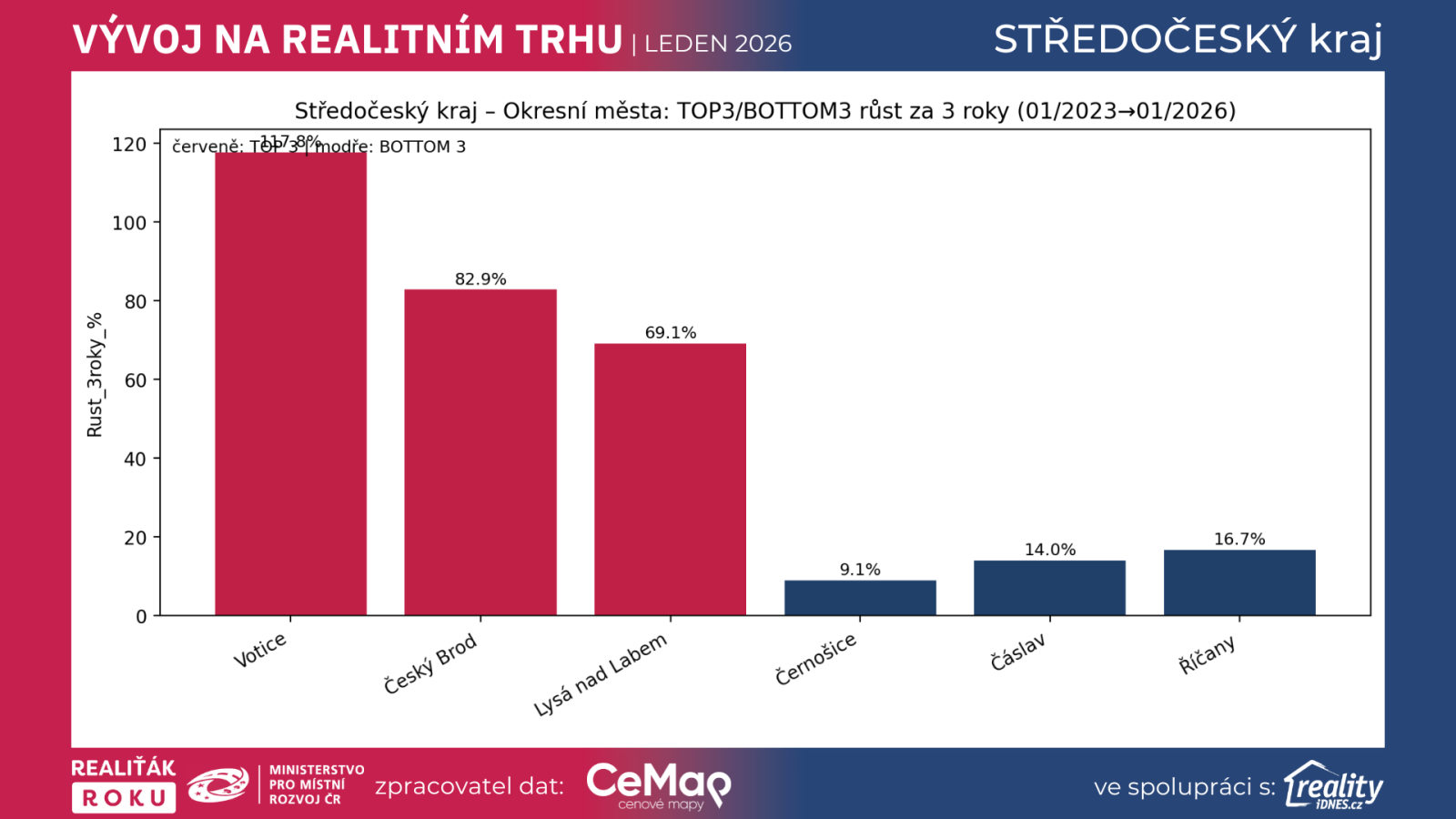 Důležité čtení těchto žebříčků: nízký růst u „prémiových“ lokalit (Říčany/Černošice) často znamená, že už byly drahé dřív, zatímco vysoký růst může být dohánění z nižší základny nebo skoková změna poptávky v daném mikroregionu.