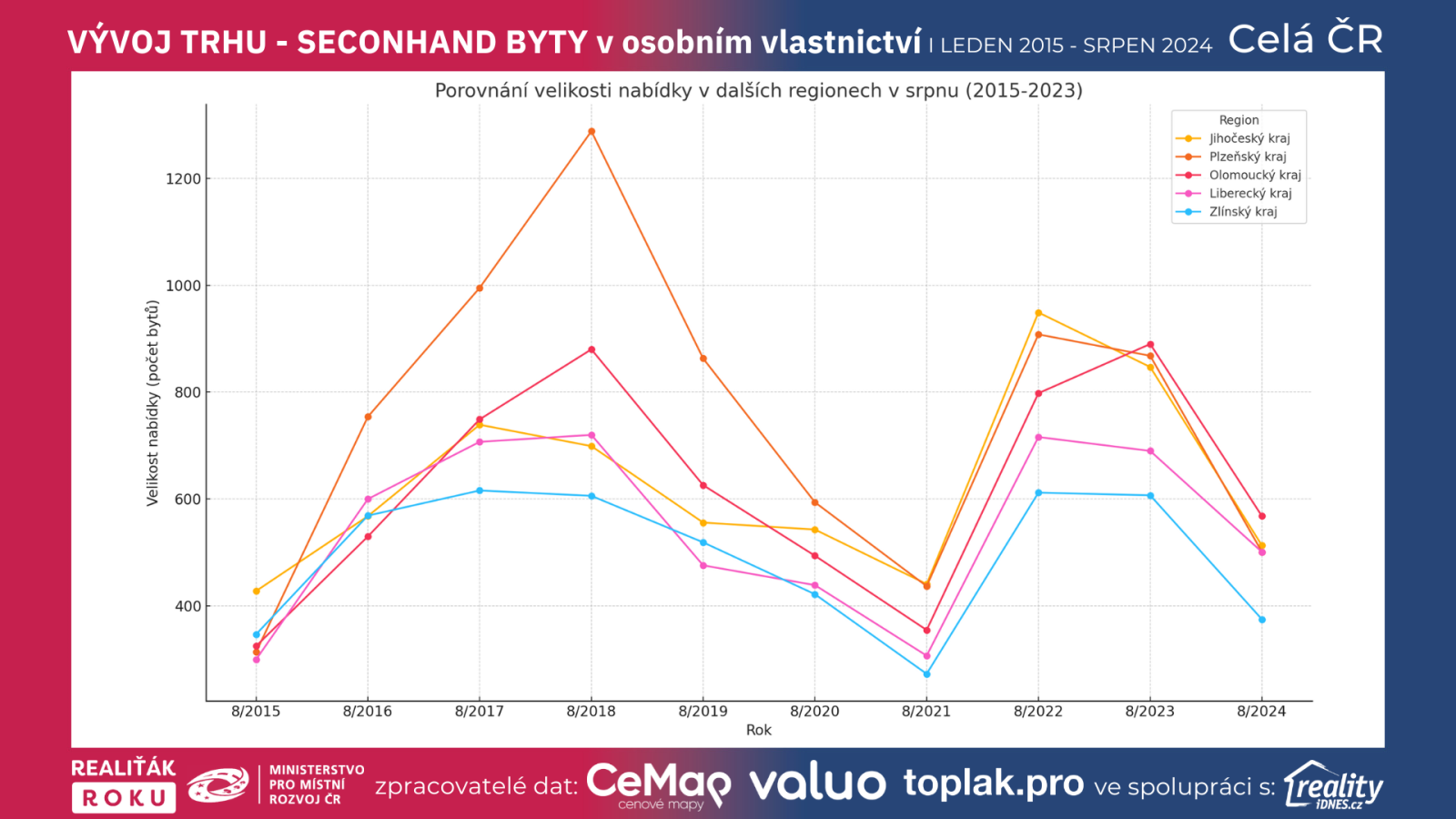 V regionech jako Středočeský a Jihomoravský kraj došlo v posledních letech k mírnému nárůstu nabídky bytů, což je spojeno s intenzivnější výstavbou a rozvojem infrastruktury. Tyto oblasti těží z blízkosti k velkým městům a zlepšující se dopravní dostupnosti, což z nich činí atraktivní lokality pro bydlení i investice.