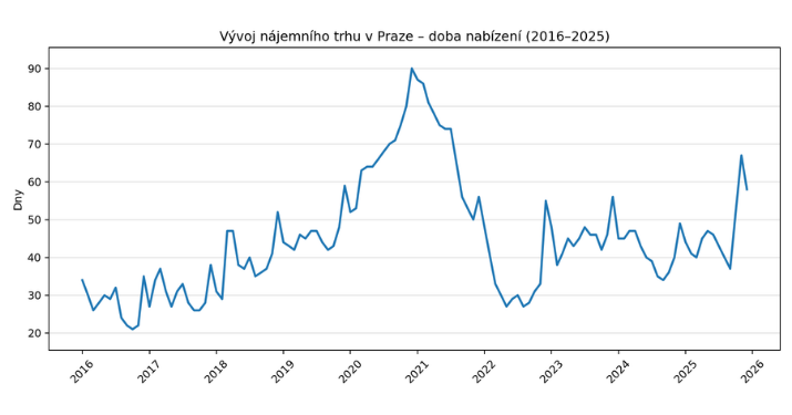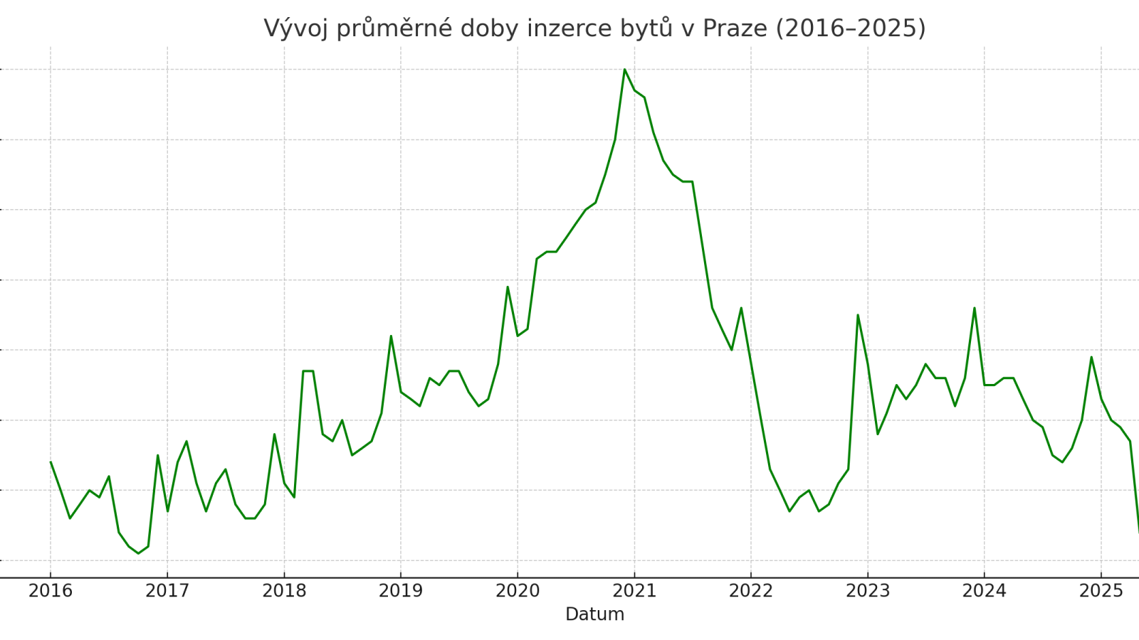 Prodloužení doby inzerce v pandemii: V roce 2020, s přílivem velkého množství volných bytů a úbytkem zájemců, se pronajímání bytů protáhlo. Významný nárůst počtu nabídek znamenal, že mnoho bytů zůstávalo v inzerci déle, než by majitelé chtěli. V průběhu roku 2020 se průměrná doba inzerce prodloužila odhadem na 70 a více dnů. Některé byty, zejména větší nebo v dříve turisticky exponovaných lokalitách, čekaly na nájemníka i několik měsíců. V první polovině roku 2021, kdy ceny i poptávka byly na minimu, kulminovala i doba inzerce – pronájmy zkrátka vázly. Z dat vyplývá, že v tomto období byla průměrná doba inzerce nejdelší za sledované období (2016–2025) – činila zhruba 2 až 3 měsíce. Pronajímatelé museli počítat s delším čekáním na vhodného zájemce a často slevovat z požadavků.