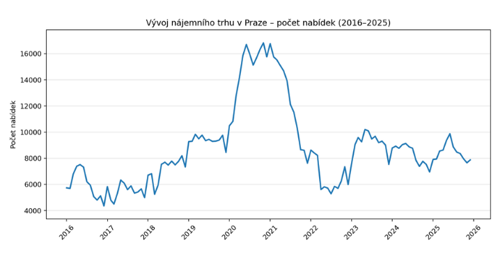 (Datový pohled: V roce 2019 kolem 7–8 tisíc nabídek; pandemický vrchol ~15 tisíc nabídek; jaro 2022 minimum ~4 700 nabídek; rok 2025 ~5–6 tisíc nabídek.)