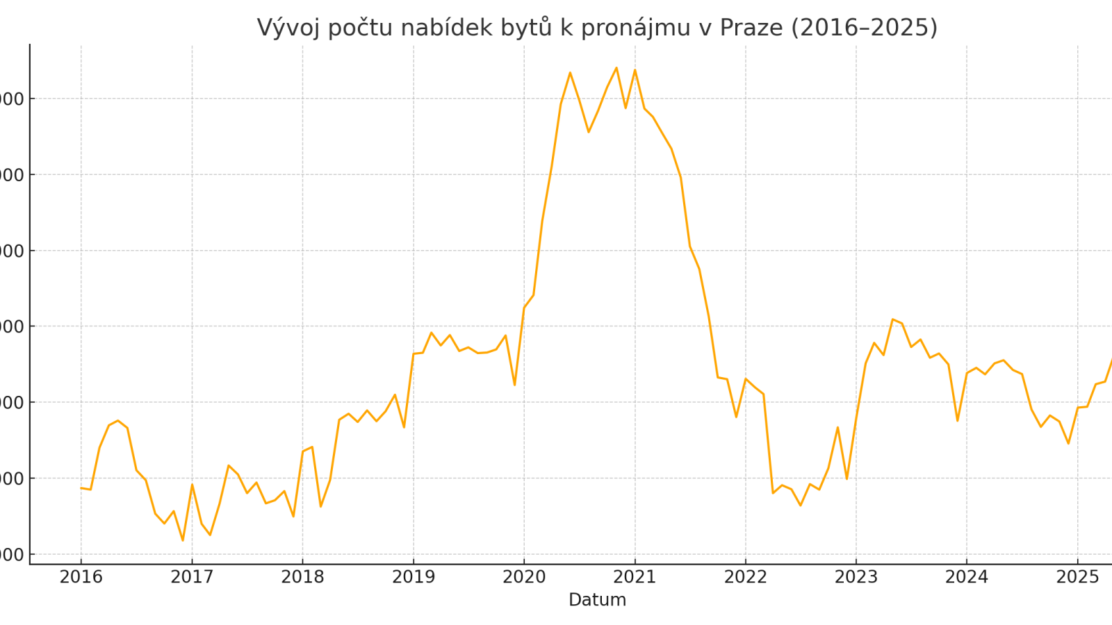 Nabídka bytů se propadla a zůstává nízká: Počet volných bytů k pronájmu se v Praze od roku 2022 držel na historickém minimu. Po prudkém poklesu na jaře 2022 (na cca 4–5 tisíc nabídek) se dostupnost bytů prakticky nezlepšila ani v roce 2023. Až koncem roku 2024 a v roce 2025 lze pozorovat mírné zvýšení počtu inzerovaných bytů (odhadem k ~6 tisícům), což však stále znamená krizový nedostatek. Pro zájemce to znamenalo obtížné hledání – na každý volný byt připadalo mnoho potenciálních nájemníků. Trh se v tomto směru začíná pomalu uvolňovat teprve v roce 2025, ale návrat k situaci před rokem 2020 (kdy bylo nabídek dvojnásobně více) je zatím v nedohlednu.