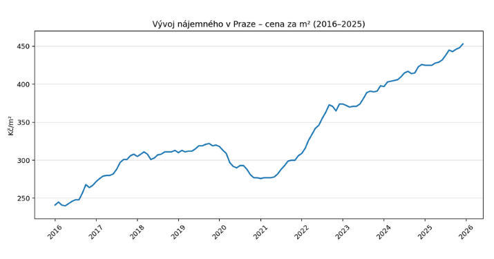 Ceny nájmů prudce vzrostly: Od začátku roku 2022 do začátku roku 2025 stoupla průměrná cena za m² zhruba ze 300 Kč na 400+ Kč, tedy přibližně o 30 %. Rok 2022 zaznamenal největší skok (dvouciferný procentuální růst), v roce 2023 tempo růstu mírně zpomalilo a koncem roku 2024 se růst téměř zastavil. V roce 2025 jsou ceny mírně pod svými maximy – trh se stabilizuje, ale nájemné zůstává velmi vysoké. Nájemníci, kteří uzavírali smlouvy v roce 2022 a později, pocítili značné zdražení bydlení.