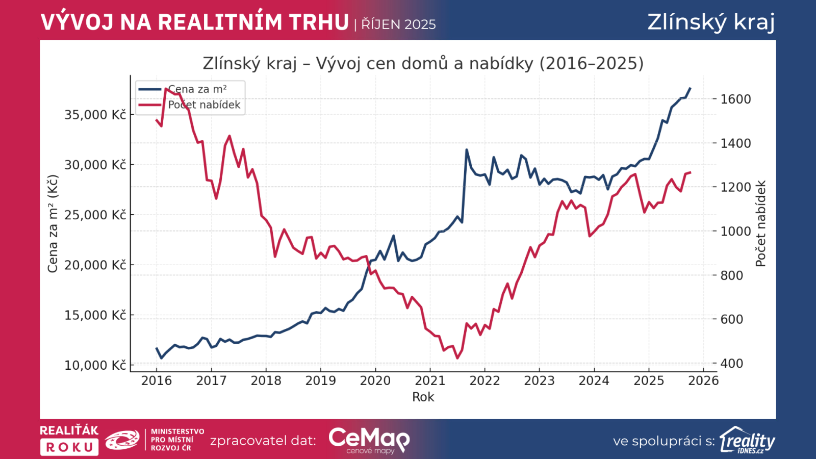 Zlínský kraj patří v roce 2025 mezi nejdynamičtější regiony u prodeje rodinných domů. Ceny meziročně vyskočily o více než čtvrtinu, zároveň se doba inzerce zkrátila o 113 dní.