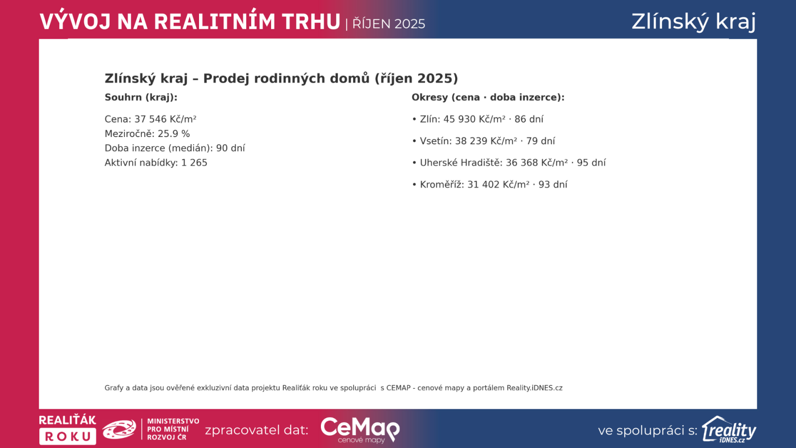 Zlínský kraj je v roce 2025 učebnicovým příkladem „rychlého, ale zdravého“ růstu u rodinných domů. Dvojciferné meziroční zdražení jde ruku v ruce se zásadním zkrácením doby prodeje – a to ne kvůli přehřátí, ale díky lepší kvalitě prodávaných domů, realistickým cenám a připraveným kupujícím. Metropole Zlín drží cenovou laťku, Vsetínsko dominuje rychlostí, Uherskohradišťsko potvrzuje silnou poptávku a Kroměřížsko zůstává vstupní branou pro rozumný rozpočet.
