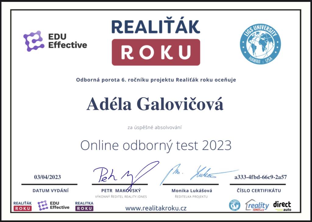 Rád bych poděkoval za profesionální přístup realitní makléřce Adéle Galovičové při koupi rodinného domu. Oceňujeme zejména vstřícnost, odbornost a ochotu, se kterou k našim požadavkům přistupovala. Spolupráce byla bezproblémová a rychlá . Jako profesionální makléřku paní Adélu Galovičovou velmi doporučuji.
