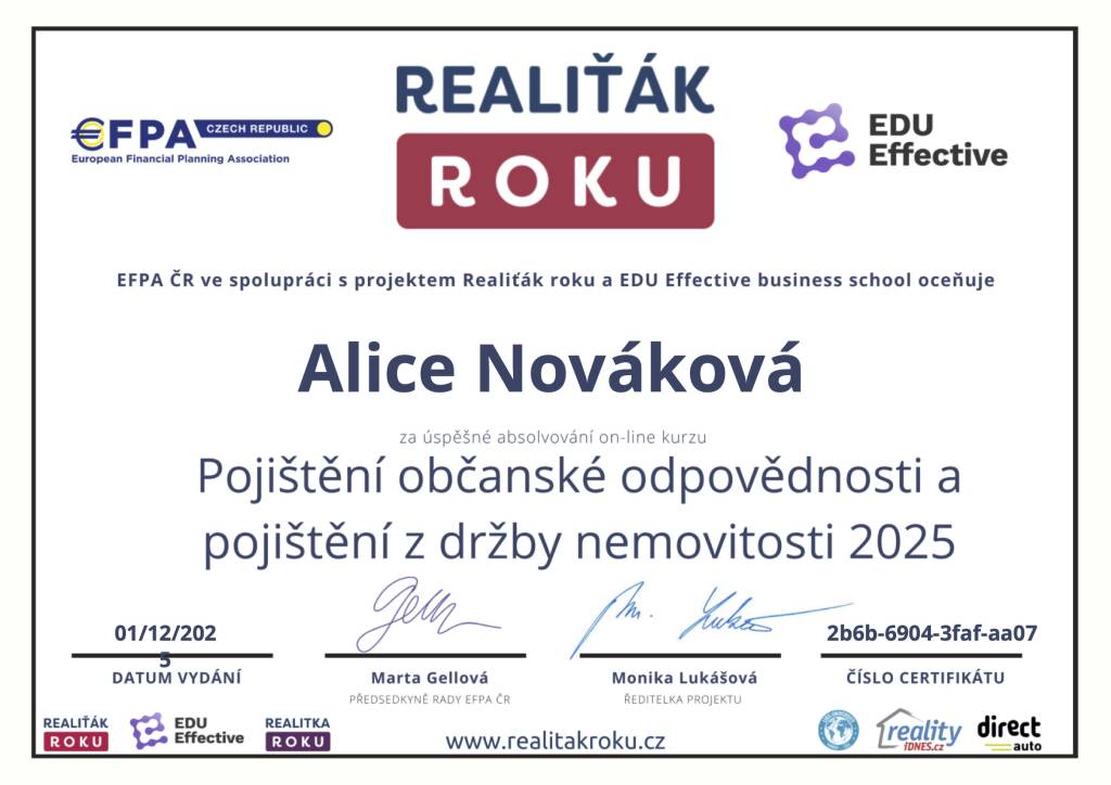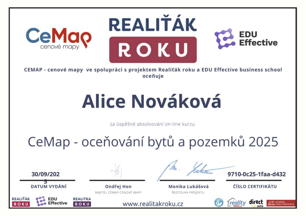 Jednali jsme s paní Mgr. Alicí Novákovou o ocenění nemovitosti v blízkosti Brna a byli jsme maximálně spokojeni. Nejen s brzkým termínem, který jsme si domluvili, avšak také s profesionálním a zároveň přátelským přístupem.