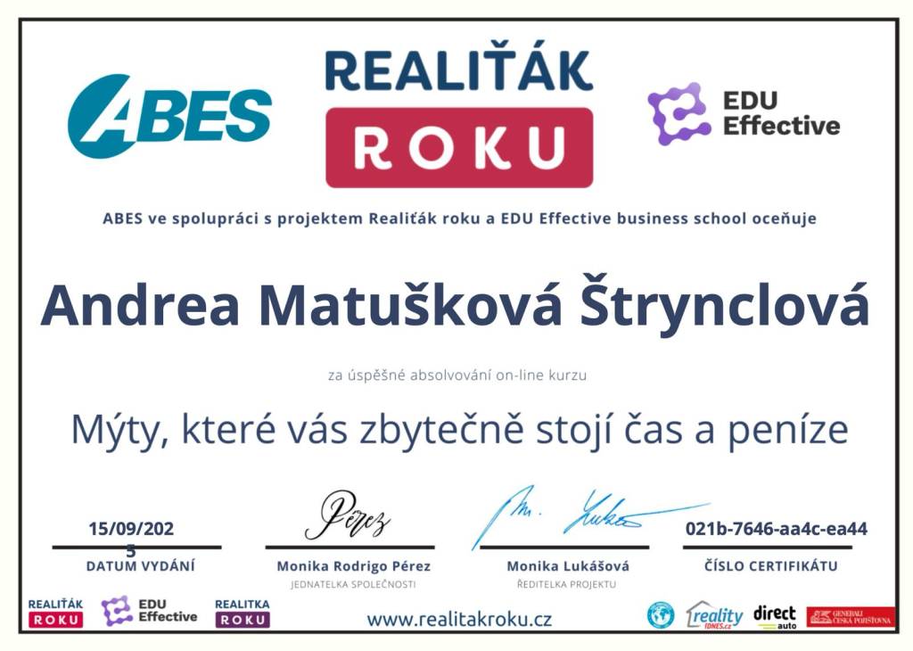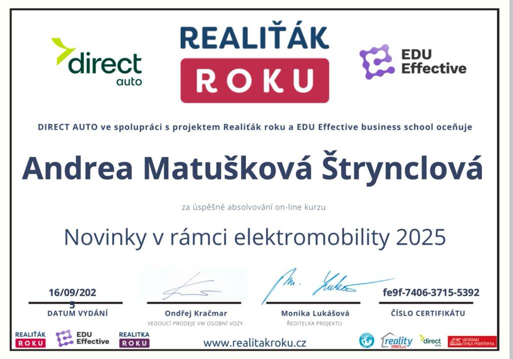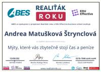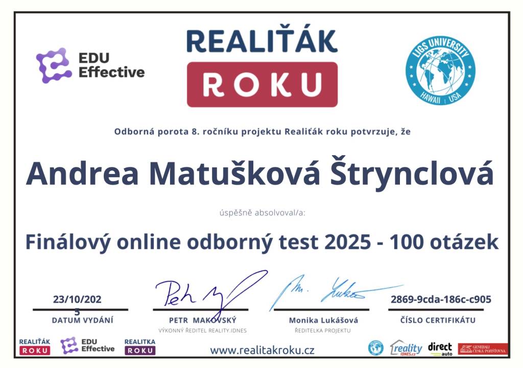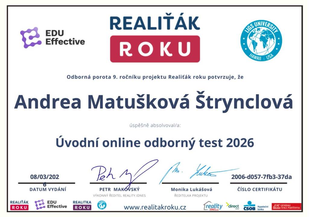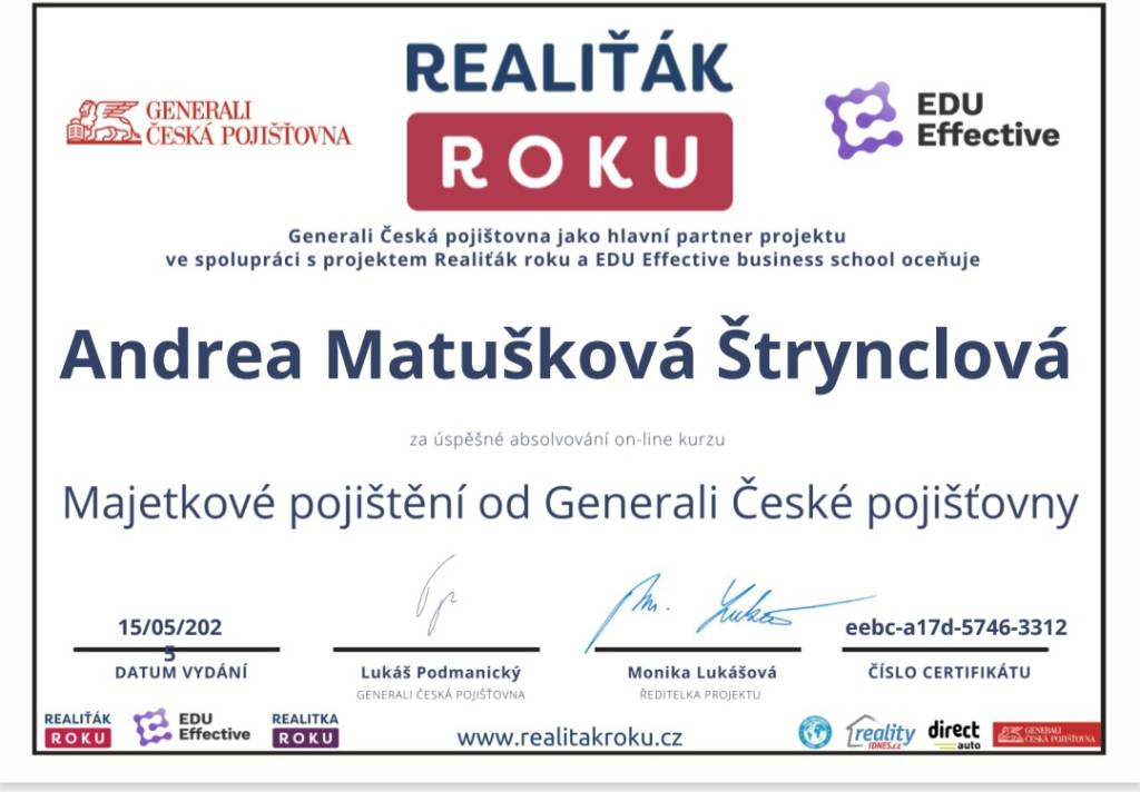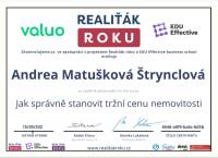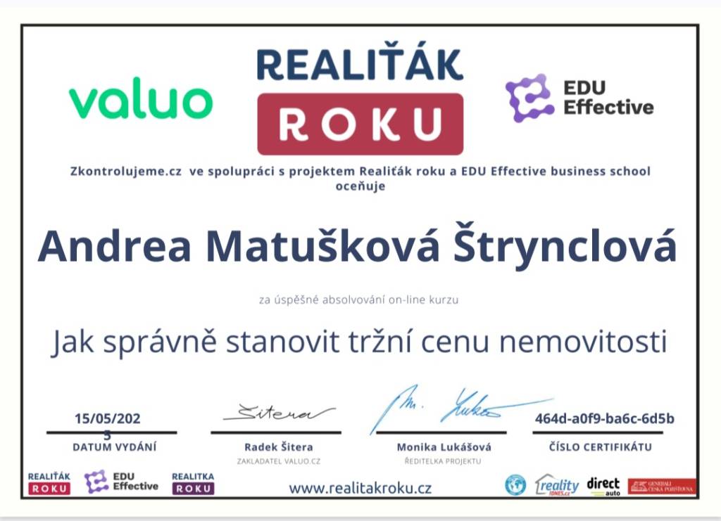 Jednoduše, pokud uvažujete o koupi či prodeji nemovitosti, nemůžete si vybrat lépe. Pro mne je paní Andrea Matušková Štrynclova absolutní špička v oblasti realit.