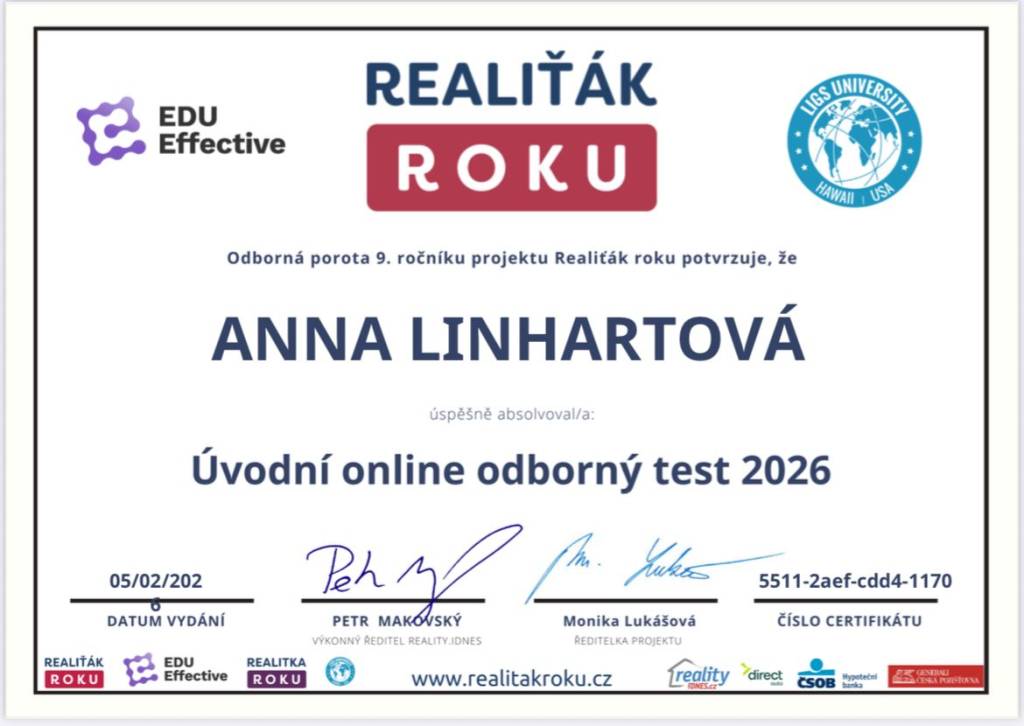 S paní Linhartovou (Aničkou) jsem měla tu čest spolupracovat při koupi bytu a musím říct, že její přístup předčil veškerá moje očekávání. Od první chvíle byla neuvěřitelně profesionální, ochotná a zároveň lidská. Co mě nejvíce ohromilo, byla její schopnost naslouchat komunikovat tak rychle, jak potřebuji. Vše ihned řešila a celým procesem mě dokonale provázela. Nebylo potřeba dlouze vysvětlovat co potřebuji. Anička přesně věděla a věci ihned řešila. Celý proces koupě bytu probíhal naprosto hladce, protože Anička měla vše pod kontrolou, komunikovala srozumitelně a vždy mě o všem včas informovala. Její ochota jít nad rámec svých povinností byla obdivuhodná. Kdykoliv jsem měla jakoukoliv otázku, byla okamžitě k dispozici, a to i mimo běžnou pracovní dobu. Měla jsem pocit, že její prioritou bylo opravdu moje pohodlí a spokojenost. Kromě své profesionality je Anička i velmi příjemná osobnost, která vás dokáže uklidnit a vše vám trpělivě vysvětlit. Pokud hledáte makléře, který je nejen odborníkem ve svém oboru, ale zároveň i člověkem, na kterého se můžete stoprocentně spolehnout, pak vám paní Linhartovou mohu jedině doporučit. Jsem si jistá, že díky ní najdete nejen perfektní nemovitost či prodáte současnou, ale budete mít i skvělý zážitek z celého procesu. Díky!