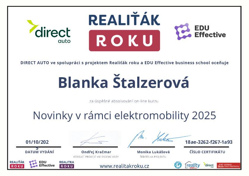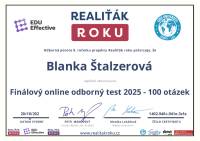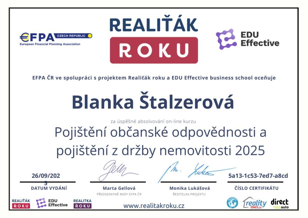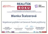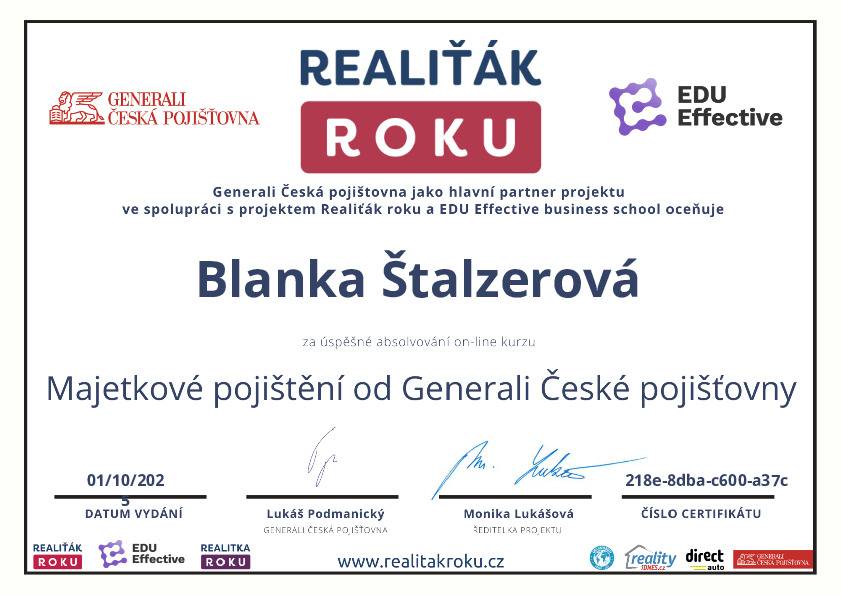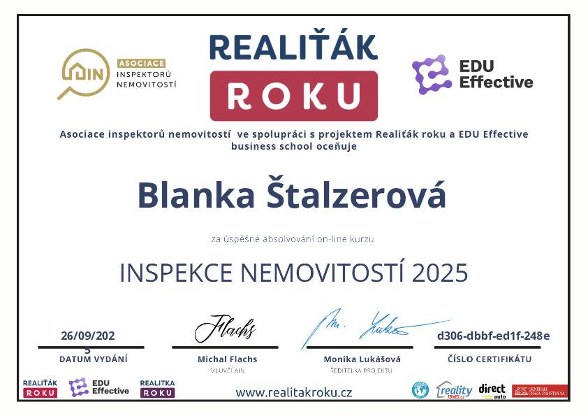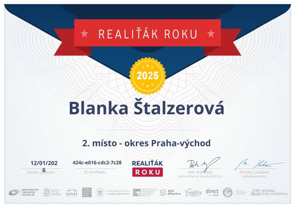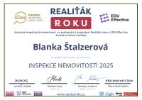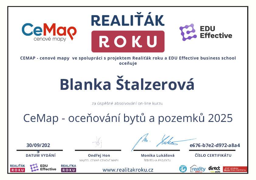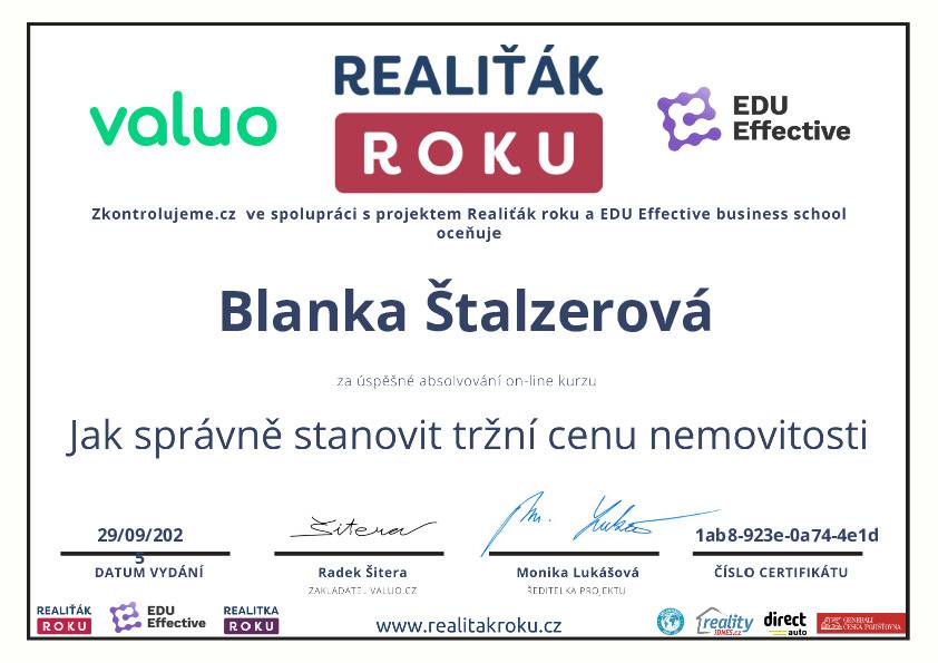 Naše společnost v minulém roce navázala spolupráci s vaší makléřkou, paní Blankou Štalzerovou. Jejím prostřednictvím (současně ještě s jiným samostatným makléřem) jsme nabízeli a následně i prodali nemovitost, kterou naše firma stavěla jako vlastní, developerský projekt. Vzhledem k tomu, že se jednalo o dvojdům a projekt nabízeli dva makléři bez exkluzivní smlouvy, máme výborné srovnání jejich práce, protože každý z makléřů nakonec prodal jednu polovinu domu. Na základě této zkušenosti jsme se rozhodli další naše projekty realizovat výhradně s vaší makléřkou, paní Blankou Štalzerovou. Nemůžeme říci, že by druhý makléř nebyl snaživý a nakonec rovněž úspěšný, ale paní Blanka svou práci odvádí s neuvěřitelnou grácií, humorem, lehkostí, profesionalitou, spolupracuje s vynikajícími hypotečními poradci, právníky a každé naše společné jednání pro mne byla radostná schůzka s milým člověkem. Přeji celé firmě mnoho úspěchů a co nejvíce takových makléřů, jako je paní Štalzerová.