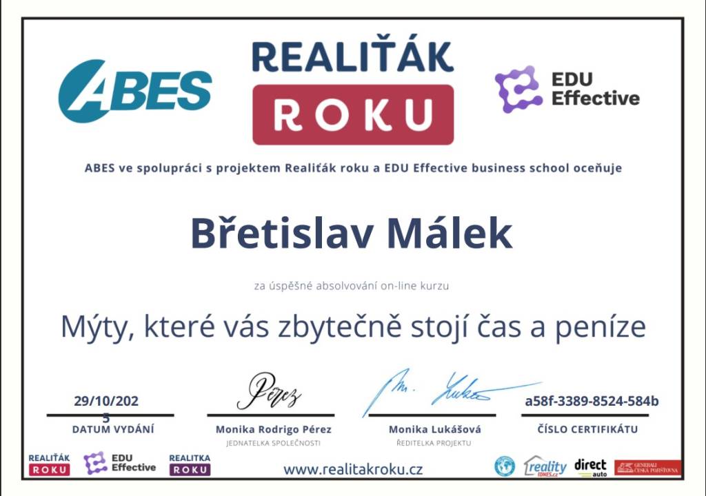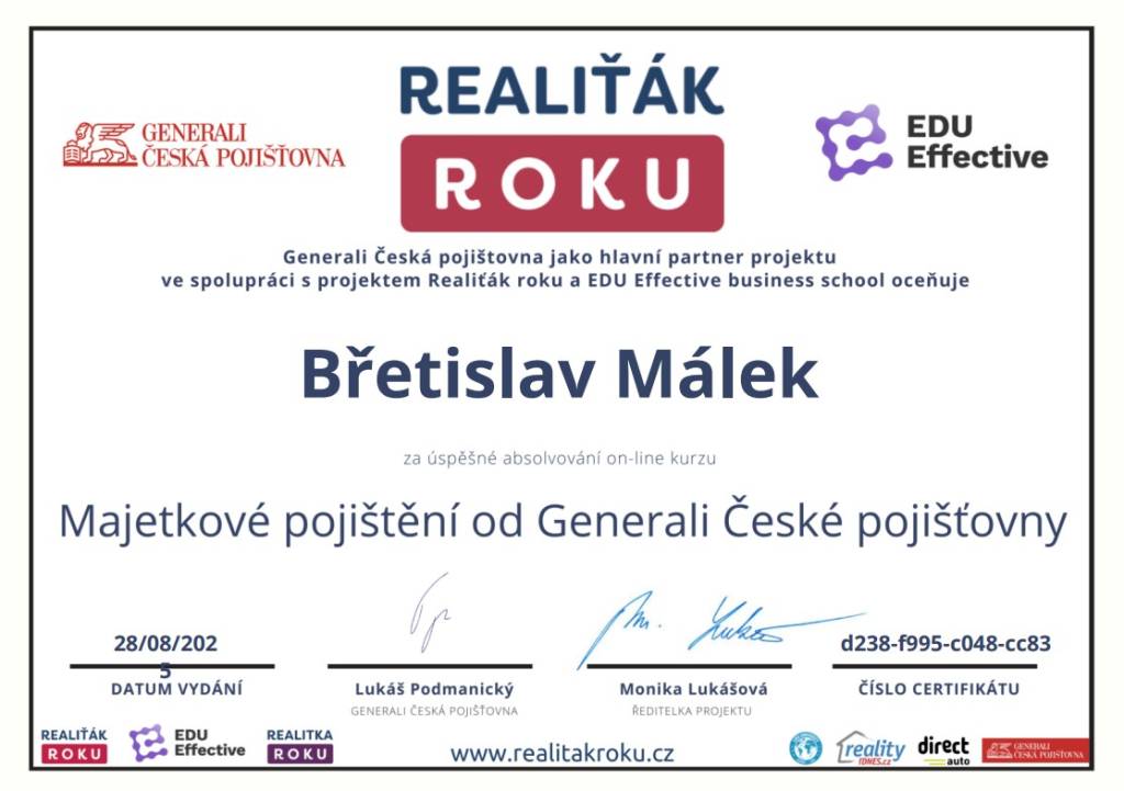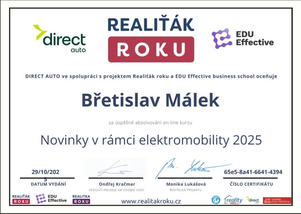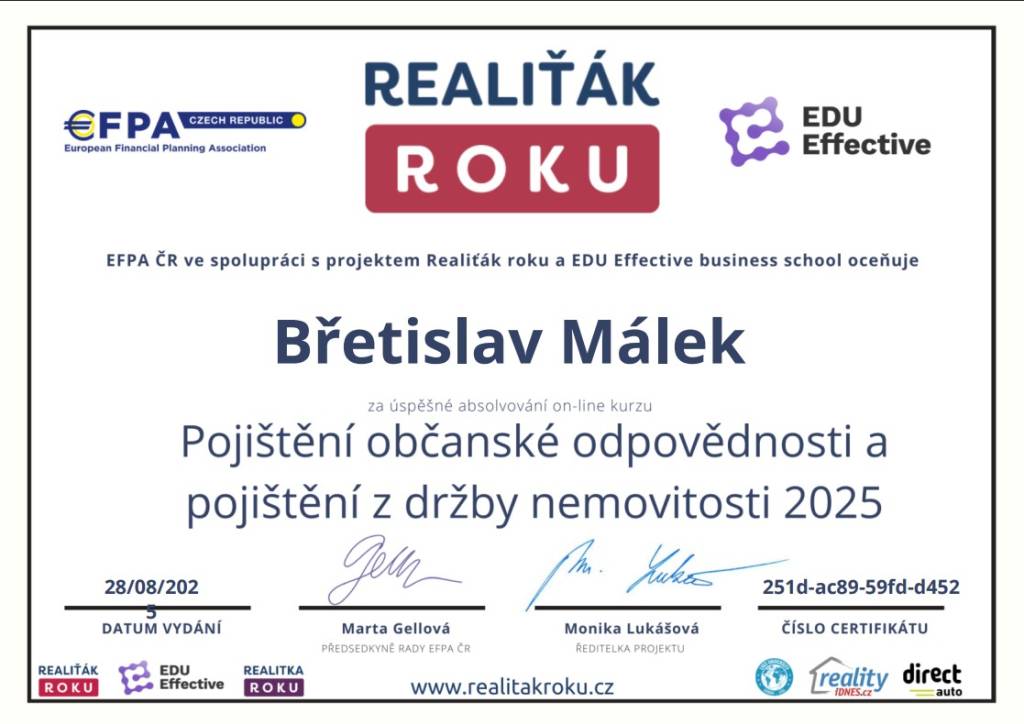 Jako certifikovaný makléř realitní kanceláře RELIA (přes 12 let) mám jasnou představu o své práci. Jsem pro své klienty bezpečným průvodcem, poradcem a spolehlivým partnerem při prodeji jejich nemovitostí, na jejich cestě k novému domovu nebo investici. Rozumím realitního trhu a jeho dynamice a snažím se neustále vzdělávat, abych mohl poskytovat nejlepší služby. Propojuji své znalosti trhu s důkladností a pečlivostí, které jsou nezbytné pro úspěšné realitní transakce. Zavázal jsem se k transparentnosti ve všech aspektech mé práce, ať už jde o komunikaci s klienty, vyjednávání s protistranami nebo při posuzování hodnoty nemovitosti. Mým přáním je zachovat slušnost a poctivost a tím přispět ke zvýšení kreditu profese realitního makléře. Nechci, aby moje služby byly pro mé klienty jen obchodem. Mým cílem je, aby si každý můj klient odnesl pozitivní zkušenost, poznání, že jeho prospěch je pro mě na prvním místě a přesvědčení, že jeho potřeby byly plně uspokojeny.