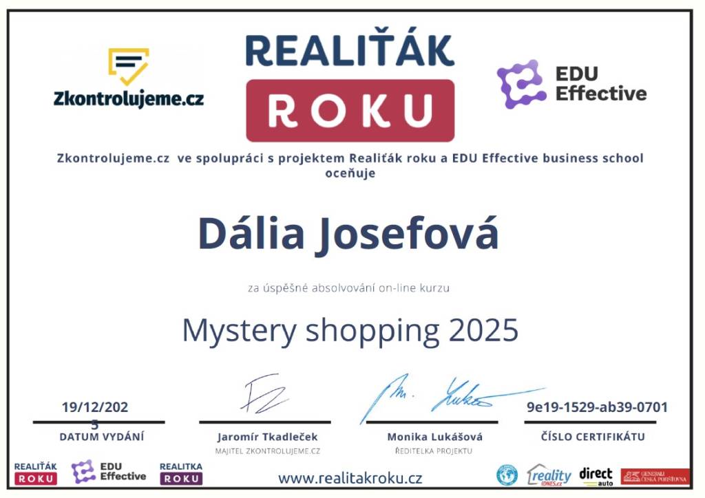 Oceňuji pečlivou přípravu prezentace nemovitosti, perfektní komunikaci, vyřízení všech formalit i ochotu nad rámec běžné práce.