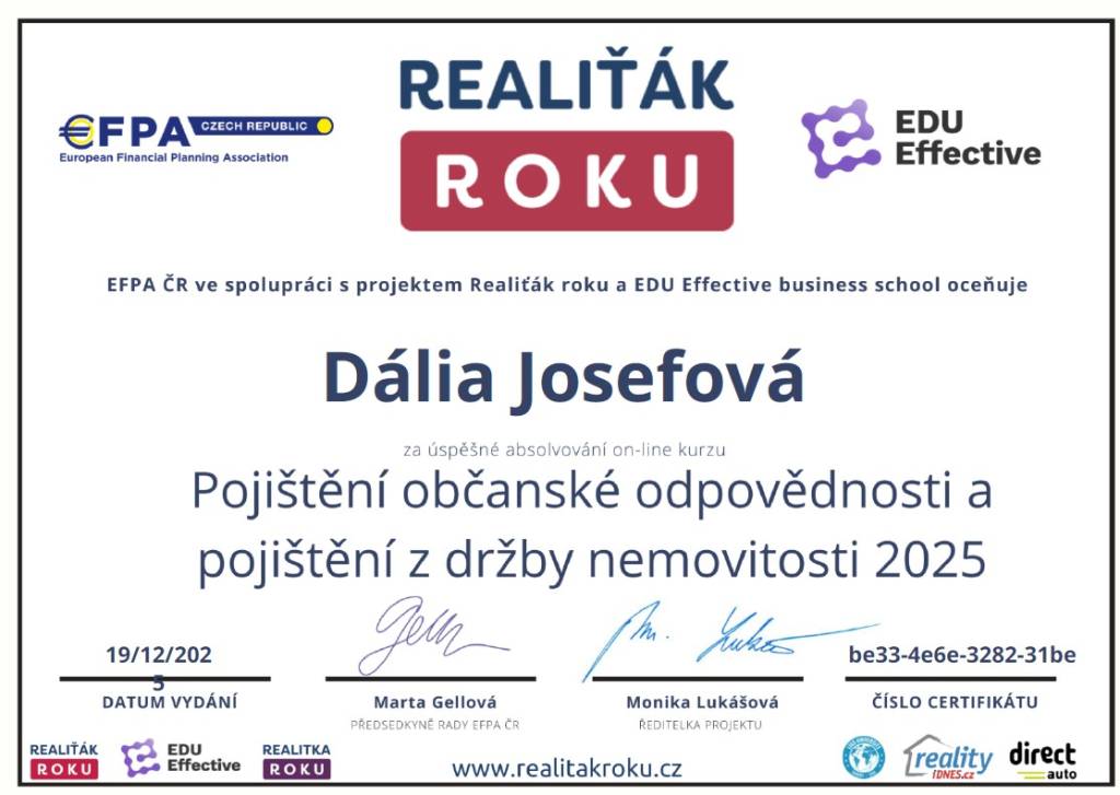 Realitní makléřku, Ing. Dálii Josefovou vřele doporučuji. Měla jsem s ní výbornou zkušenost. Při jednáních je velmi milá, bez zbytečných průtahů, vstřícná, pečlivá, klienti jsou její prioritou. Lepšího a profesionálnějšího makléře jsem doposud nepoznala. Děkuji za veškerou péči.